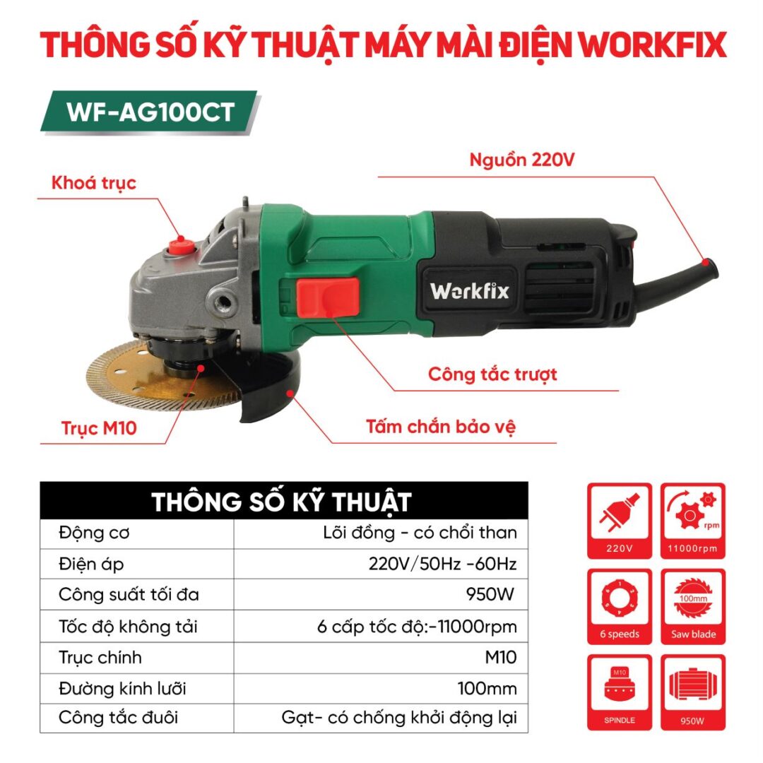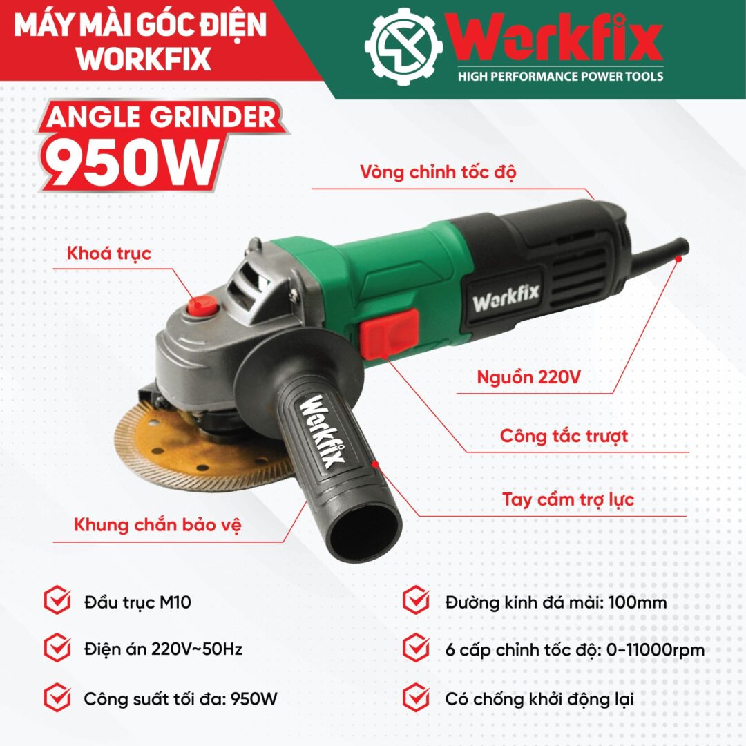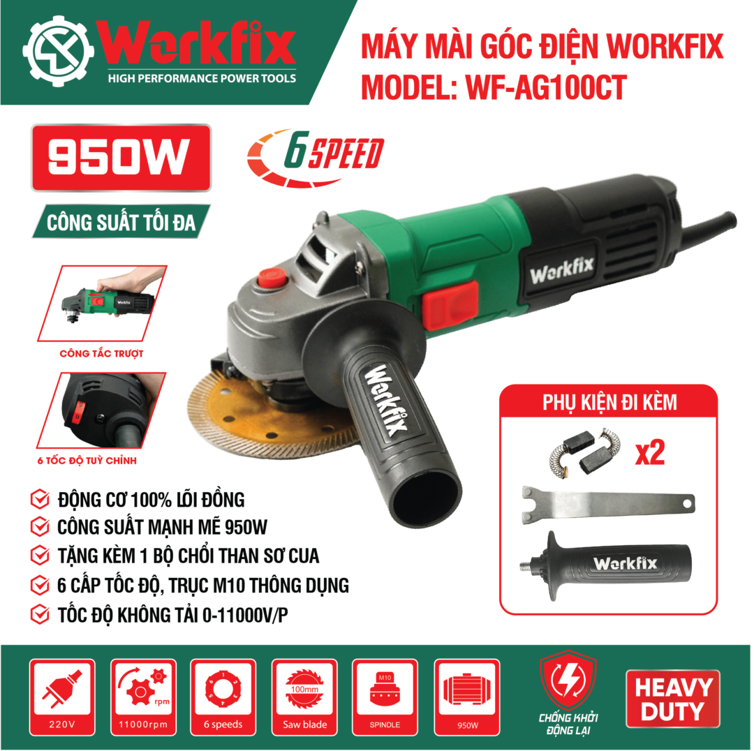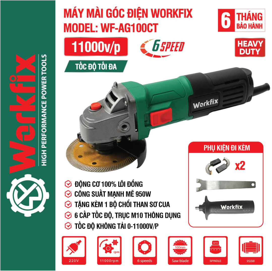 – Tên sản phẩm: Máy mài cầm tay WORKFIX WF-AG100CT, Công tắc cạnh 950W 6 Tốc độ Chống khởi động lại