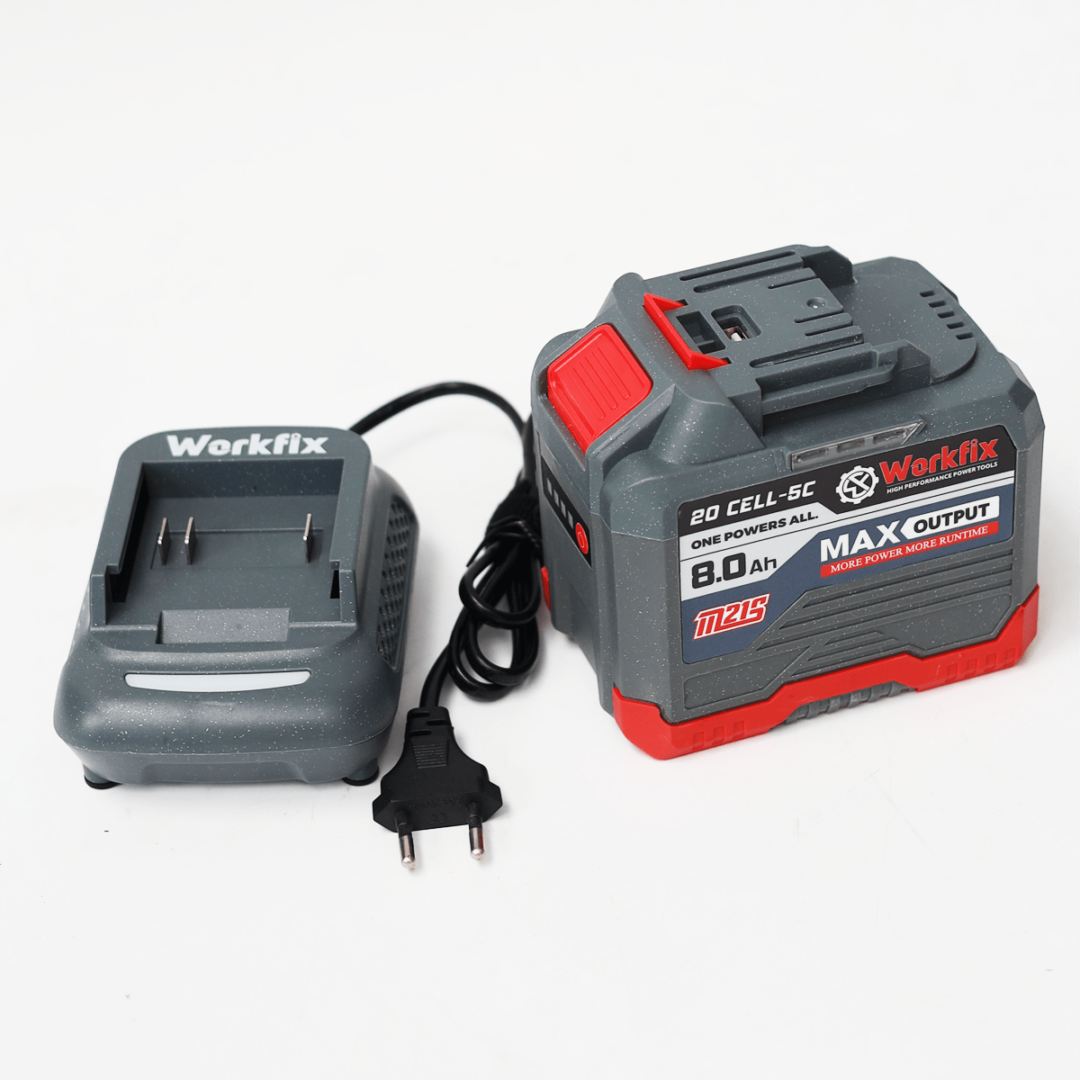 Trọn bộ sản phẩm gồm: 1 Pin 20 Cell 8Ah cho máy khoan,cắt,mài – 1 Sạc nhanh – 1 Đế chuyển điện 220V – 1 Hộp đựng