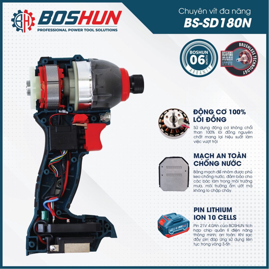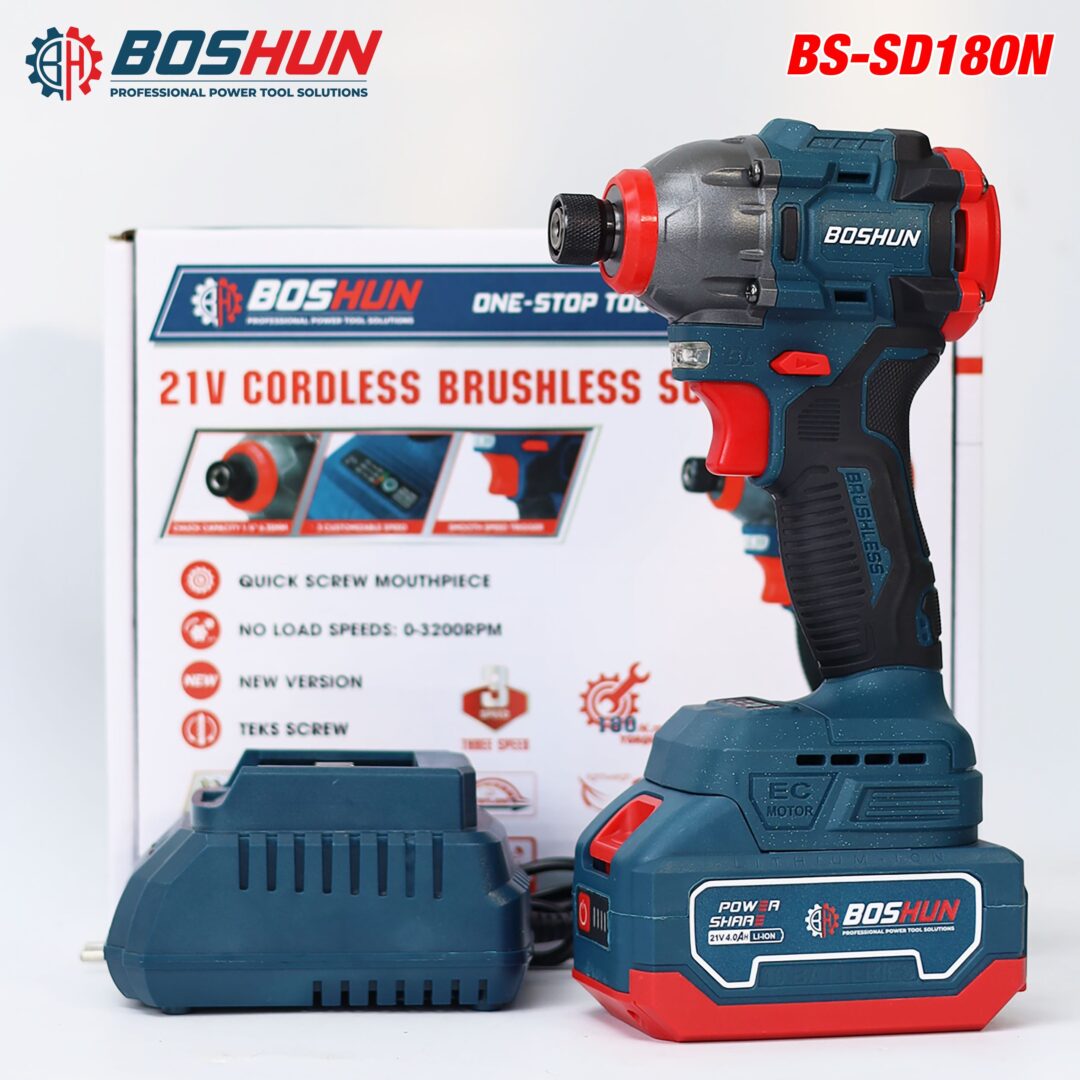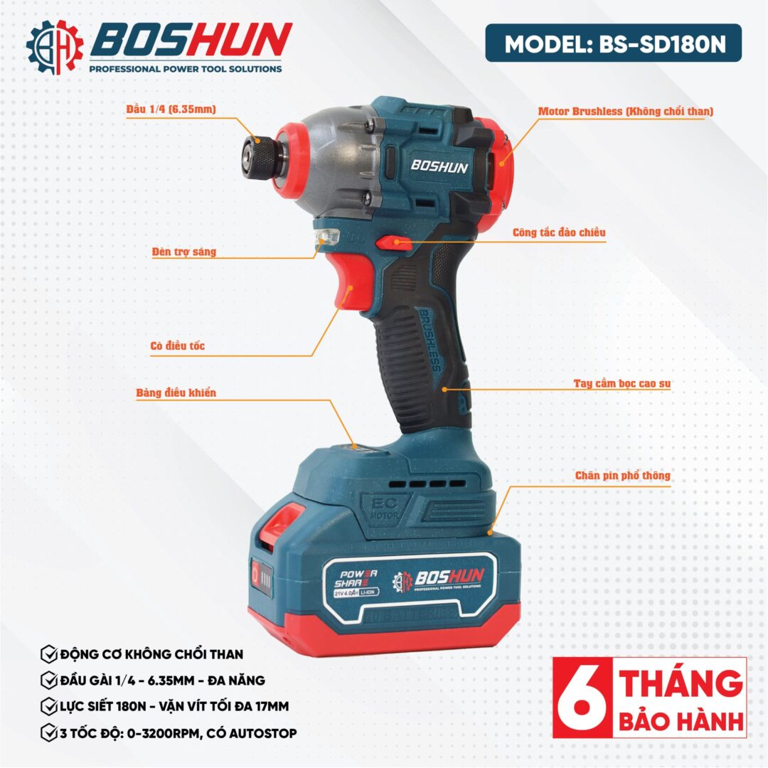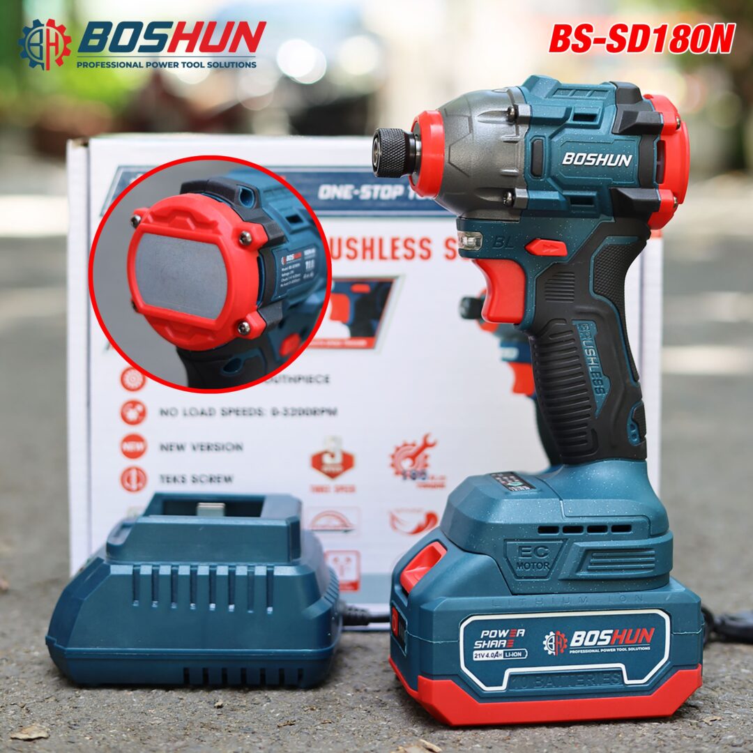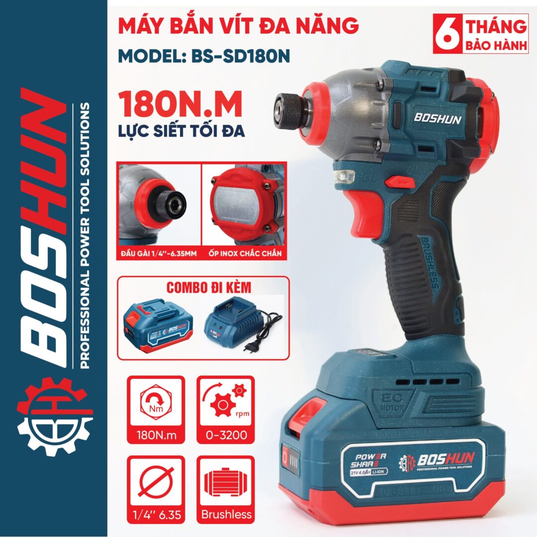 - Tên sản phẩm: Máy Bắn vít Boshun BS-SD180N, Lực siết 180Nm, 3 mức chỉnh tốc độ – Không chổi than – Chân phổ thông