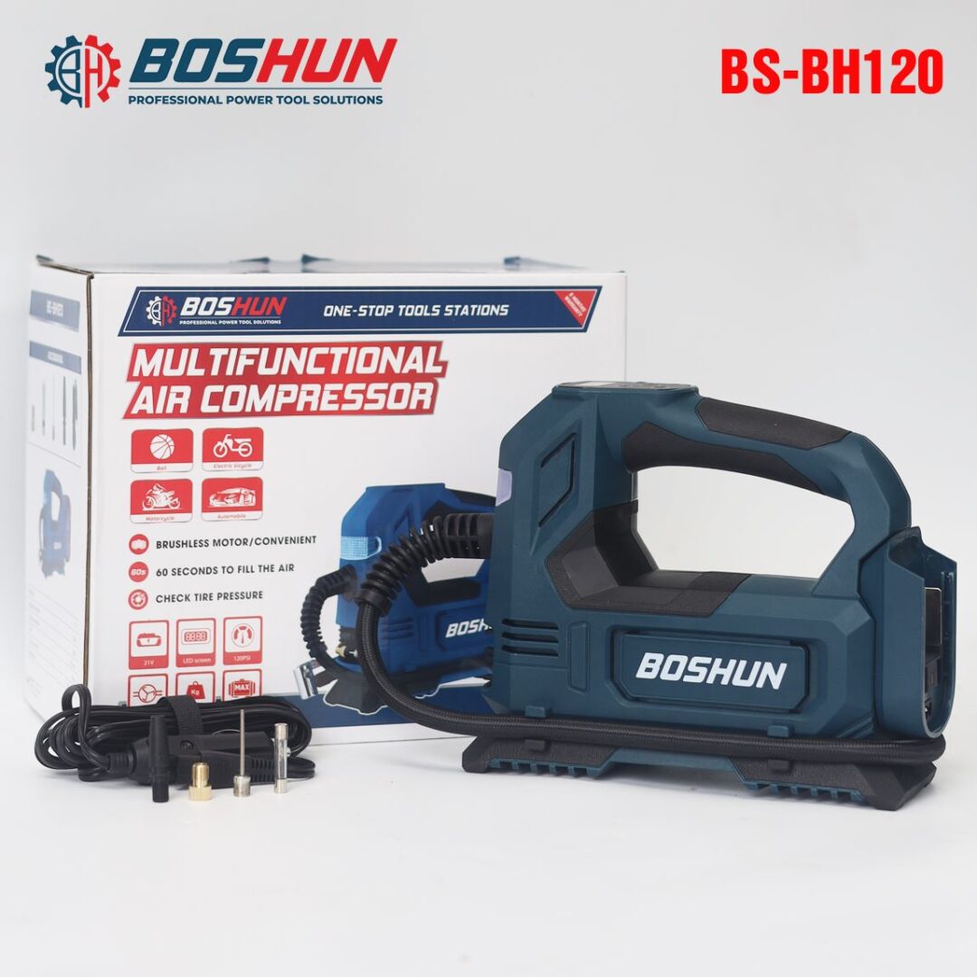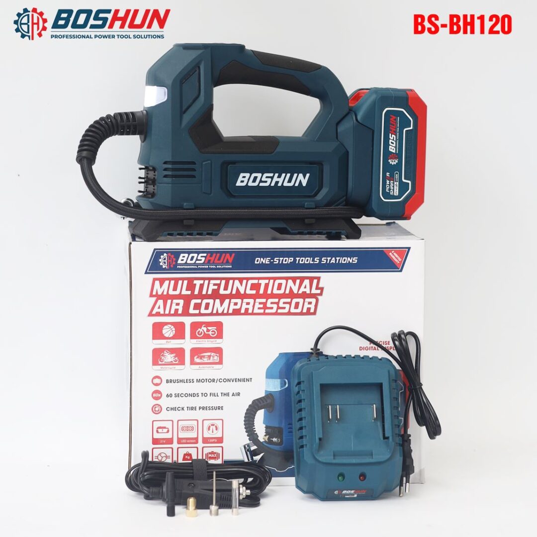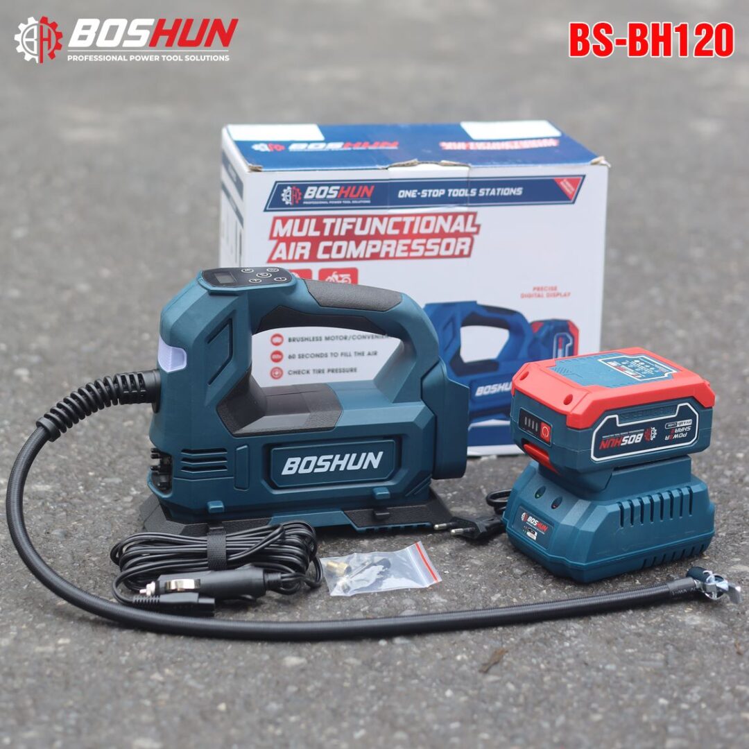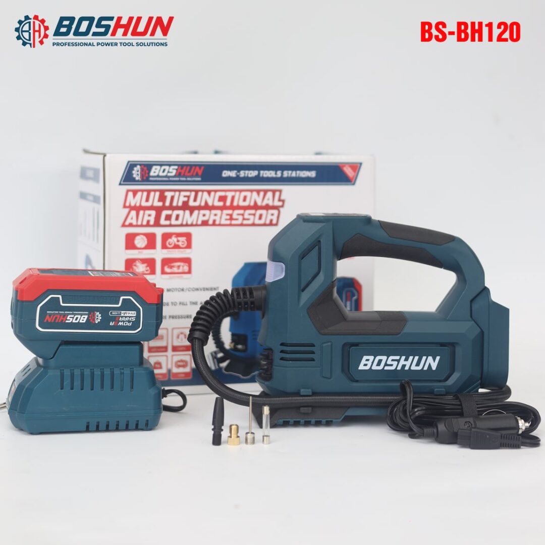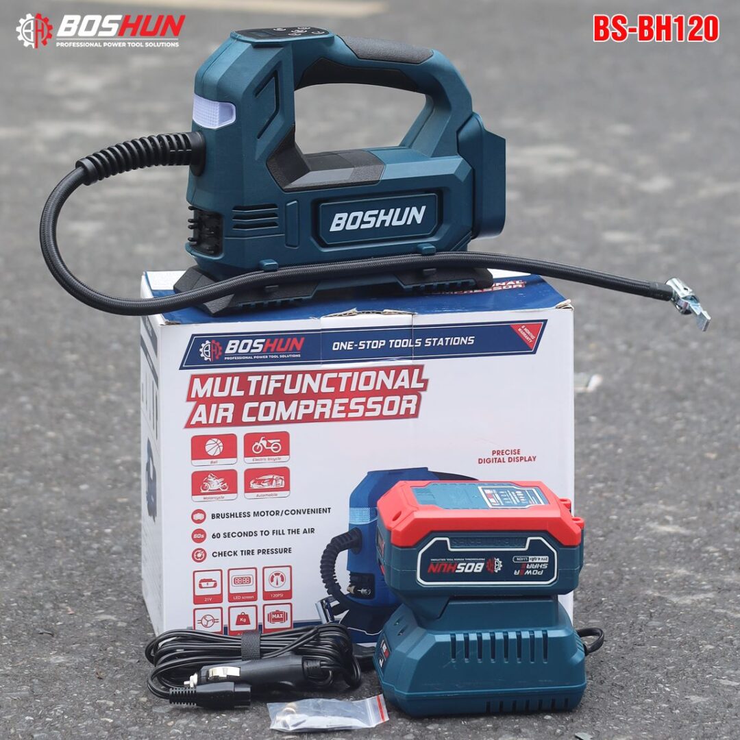 - Tên sản phẩm: Máy bơm hơi pin BOSHUN BS-BH120, 120w, Nặng 940gram, Áp suất tối đa 120 psi, Màn hình led