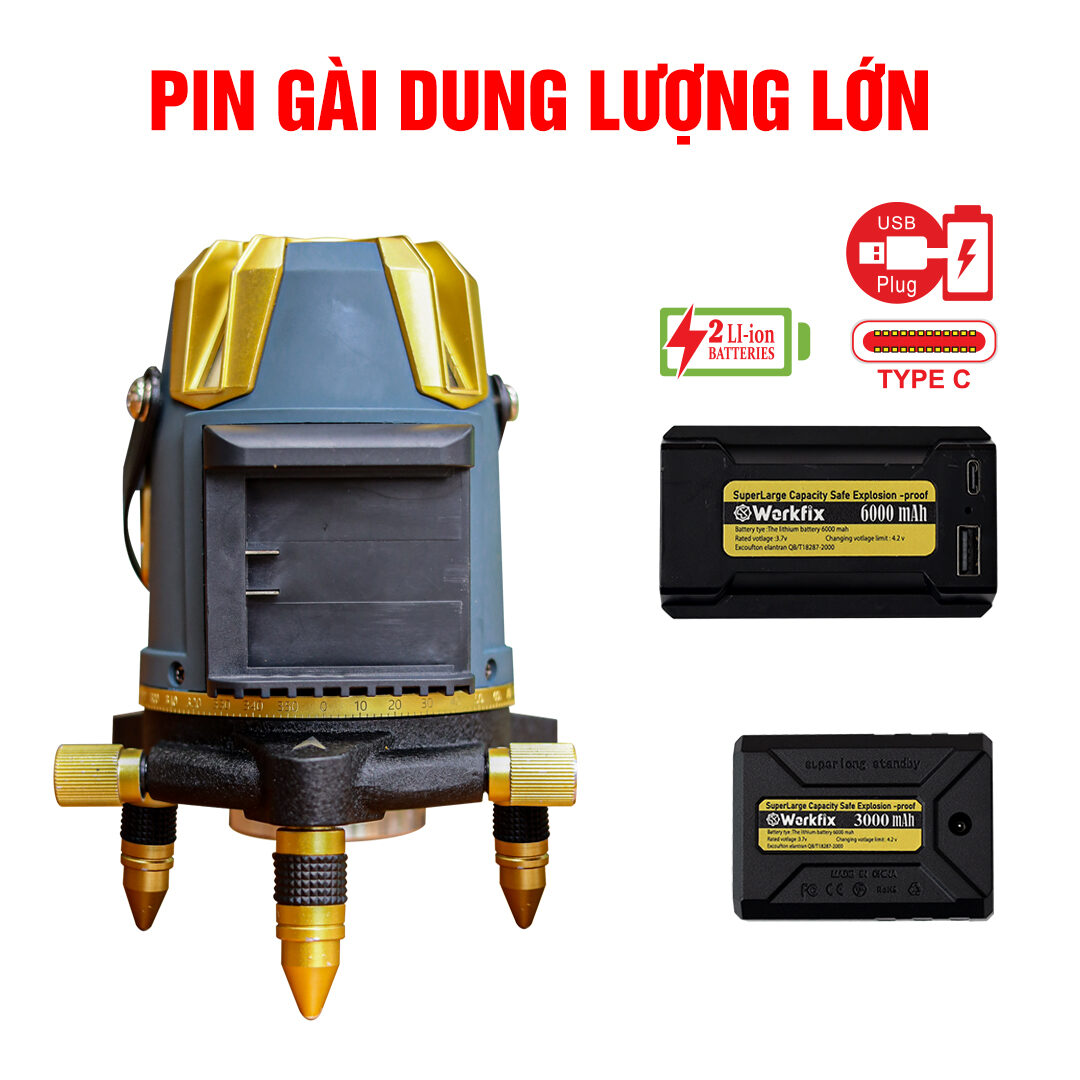 Máy cân bằng laser Workfix LS05XC được trang bị 2 pin lithium dung lượng 3000mAh và 6000mA giúp tăng thời lượng sử dụng liên tục nhiều giờ. Sạc nhanh chuẩn type-c tiết kiệm thời gian sạc pin nhanh chóng