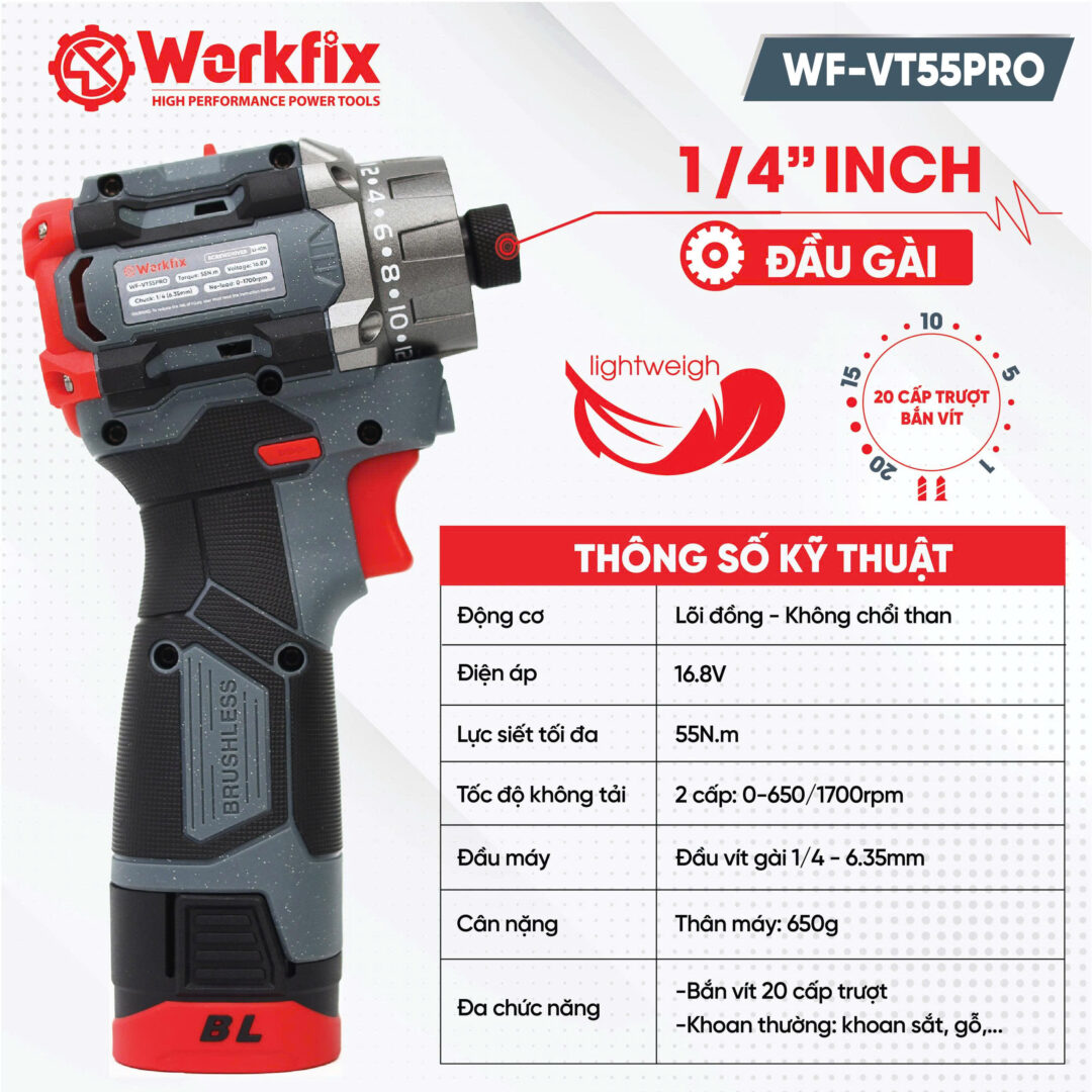 Máy bắn vít Workfix WF-VT55PRO được trang bị đầu gài nhanh 1/4” (6.35mm) – kích thước mũi khoan, mũi vít chuyên dụng