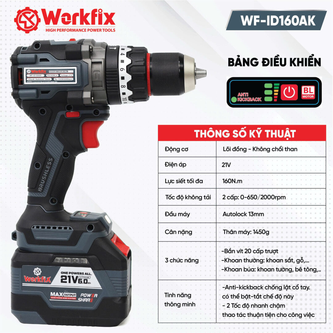 Máy chuyên vít có lực siết 55N cực mạnh, cho phép siết mở, vặn vít ốc, bulong. Máy bắn vít Workfix cực nhẹ chỉ 650g không lo đau mỏi tay