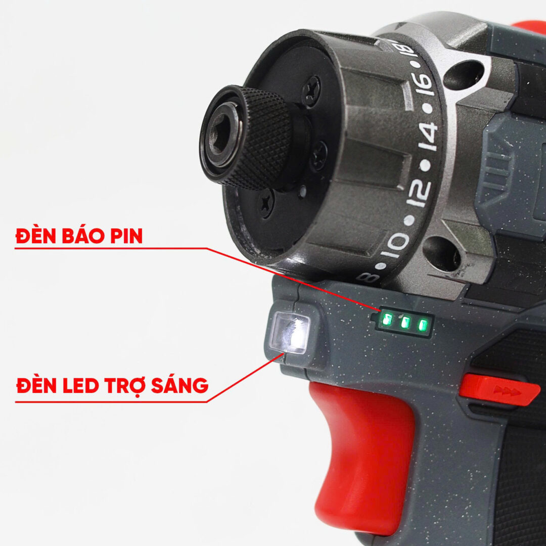Máy chuyên vít được trang bị đèn báo pin và đèn led trợ sáng giúp làm việc trong điều kiện thiếu ánh sáng