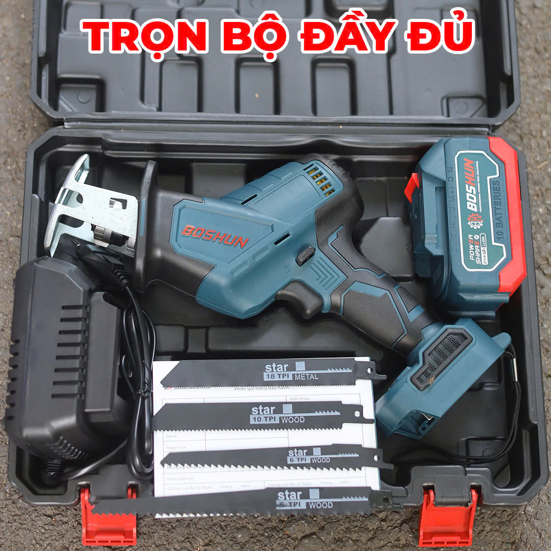 • TRỌN BỘ SẢN PHẨM: 1 thân máy, 1 pin 10cell, 1 sạc, 1 hộp nhựa, 4 lưỡi cưa.