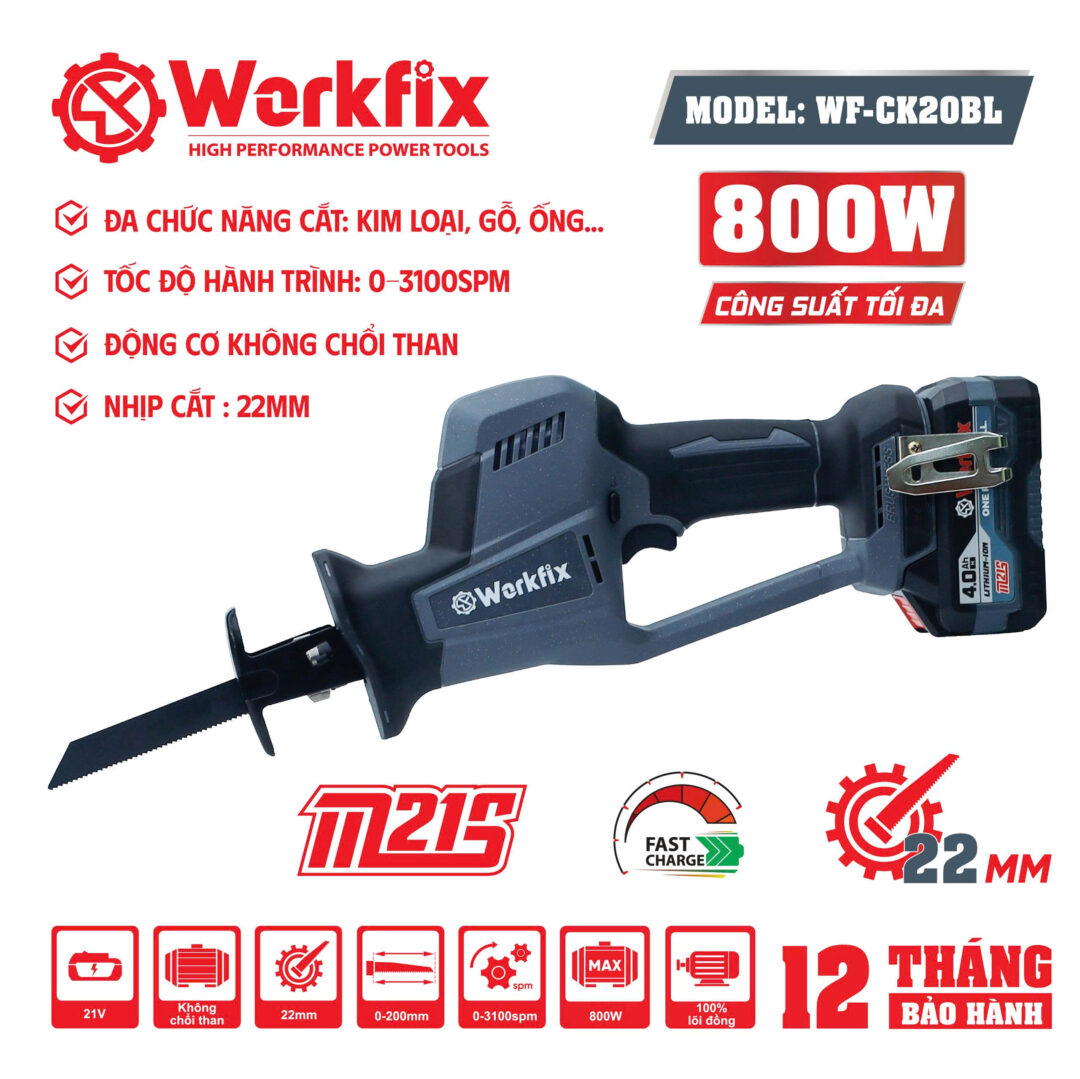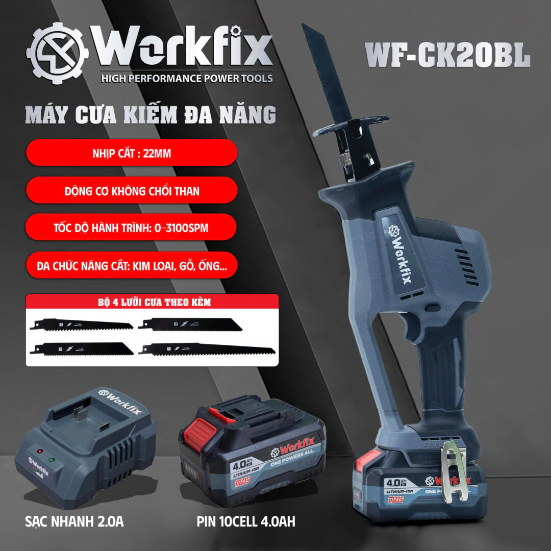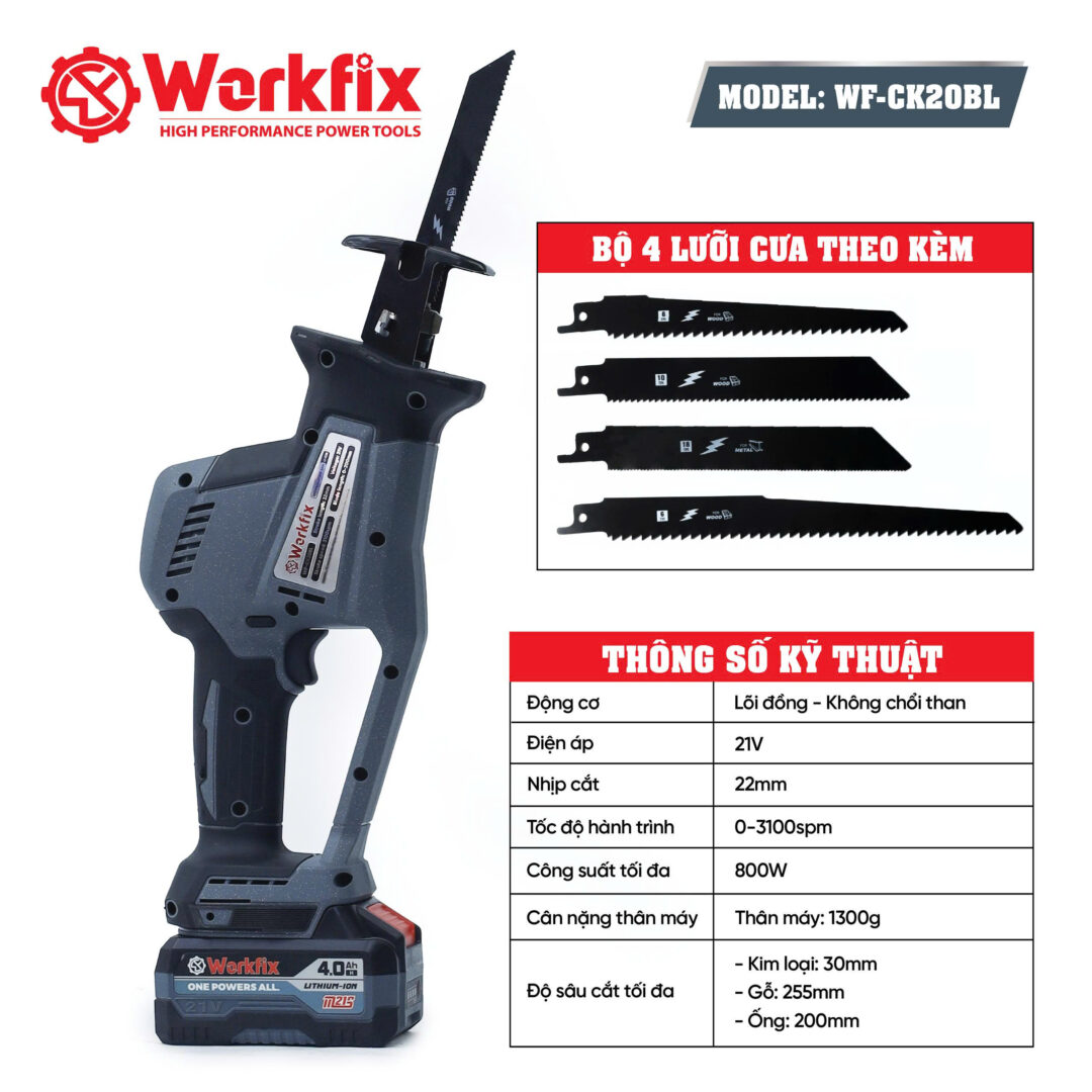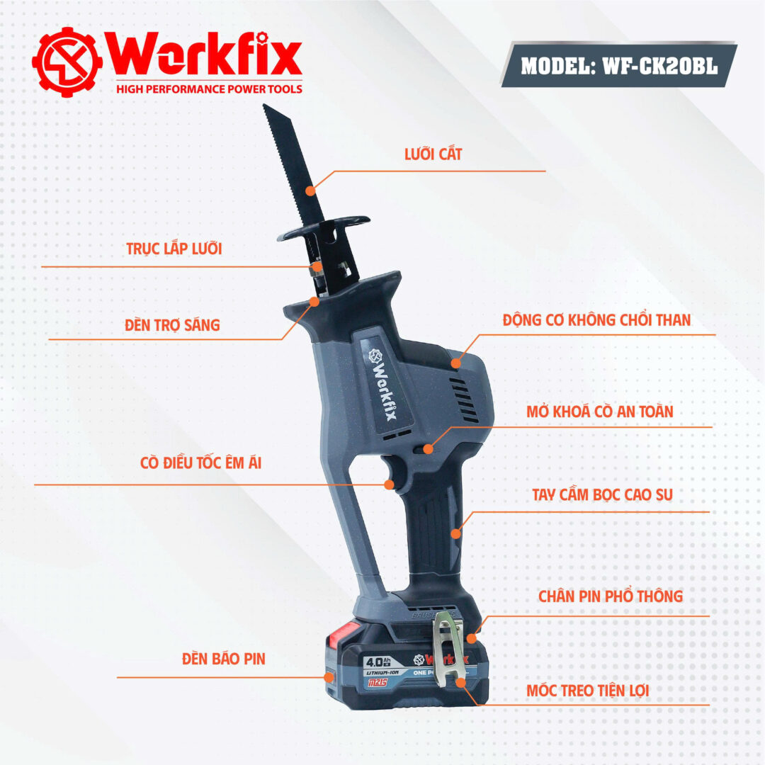 Máy cưa kiếm dùng pin Workfix WF-CK20BL được trang bị động cơ không chổi than (Brushless Motor) giúp giảm ma sát, tiết kiệm năng lượng, hạn chế sinh nhiệt và nâng cao tuổi thọ máy.