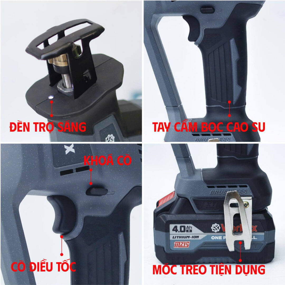 Máy cưa kiếm có đèn trợ sáng giúp làm việc trong tối; tay cầm bọc cao su cực chắc chắn, chống trượt. Ngoài ra máy có cò điều tốc, khóa cổ an toàn cùng móc treo tiện dụng