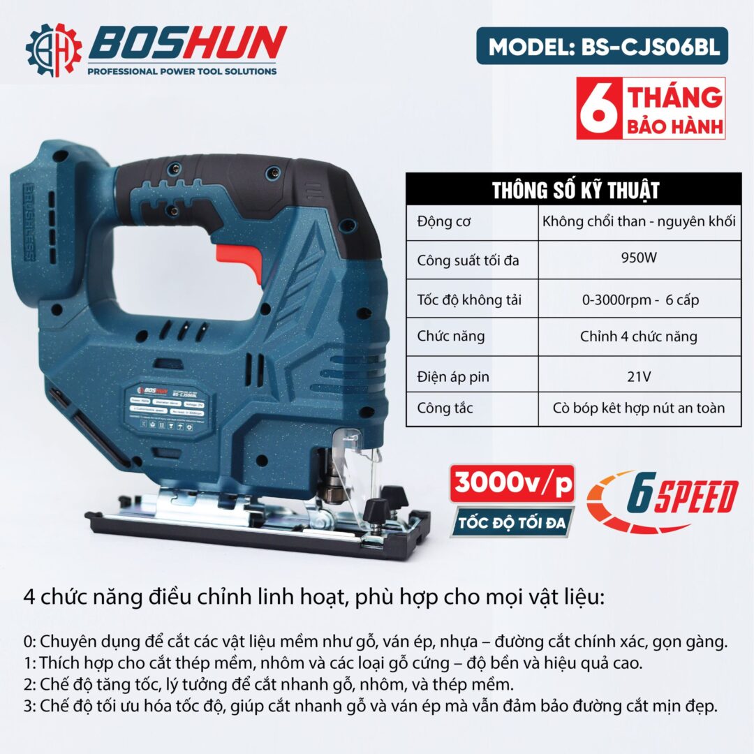 - Điều chỉnh tốc độ: Có thể có nút điều chỉnh nhiều cấp độ tốc độ cắt, phù hợp với các loại vật liệu khác nhau như gỗ, kim loại, nhựa.
