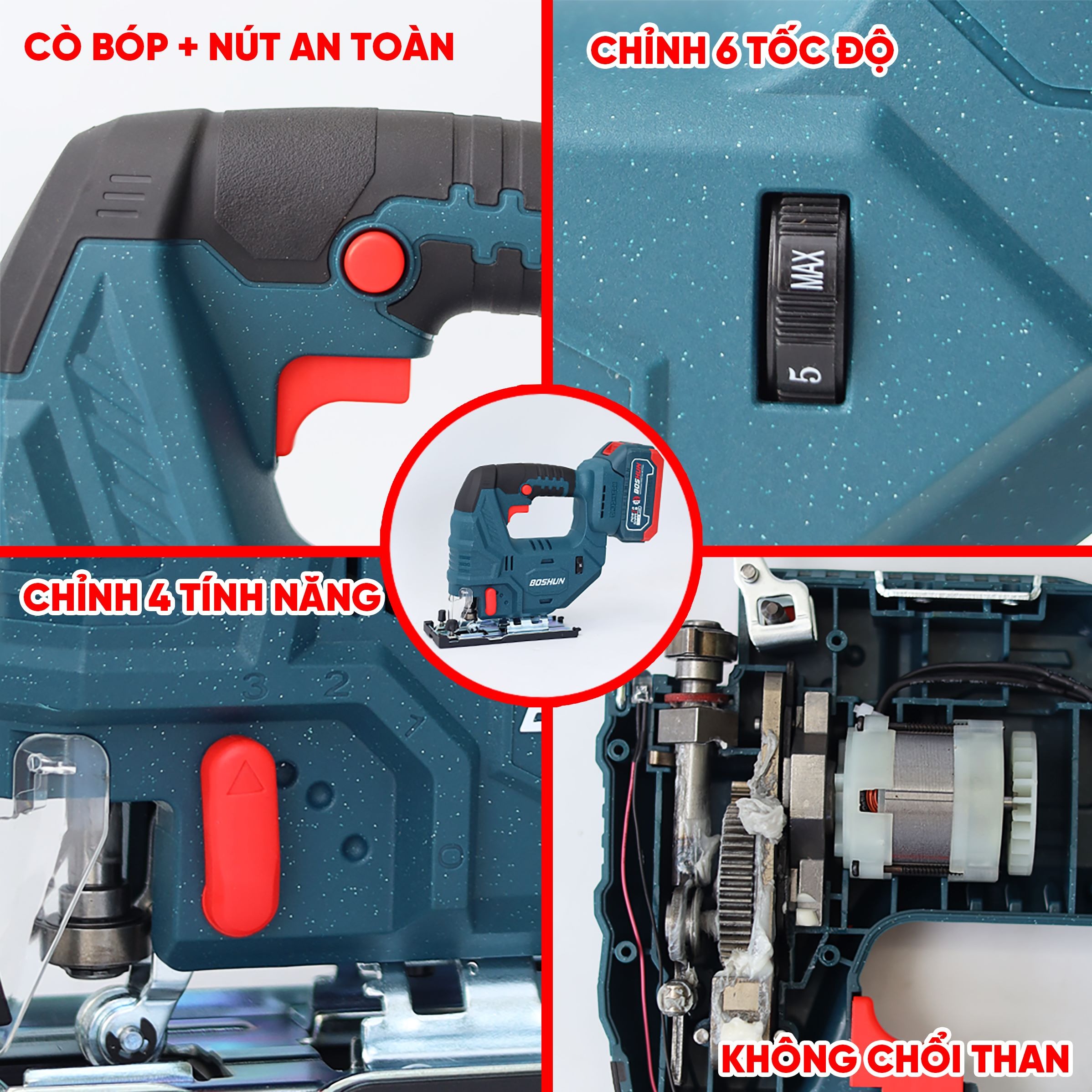 - Điều chỉnh tốc độ: Có thể có nút điều chỉnh nhiều cấp độ tốc độ cắt, phù hợp với các loại vật liệu khác nhau như gỗ, kim loại, nhựa.