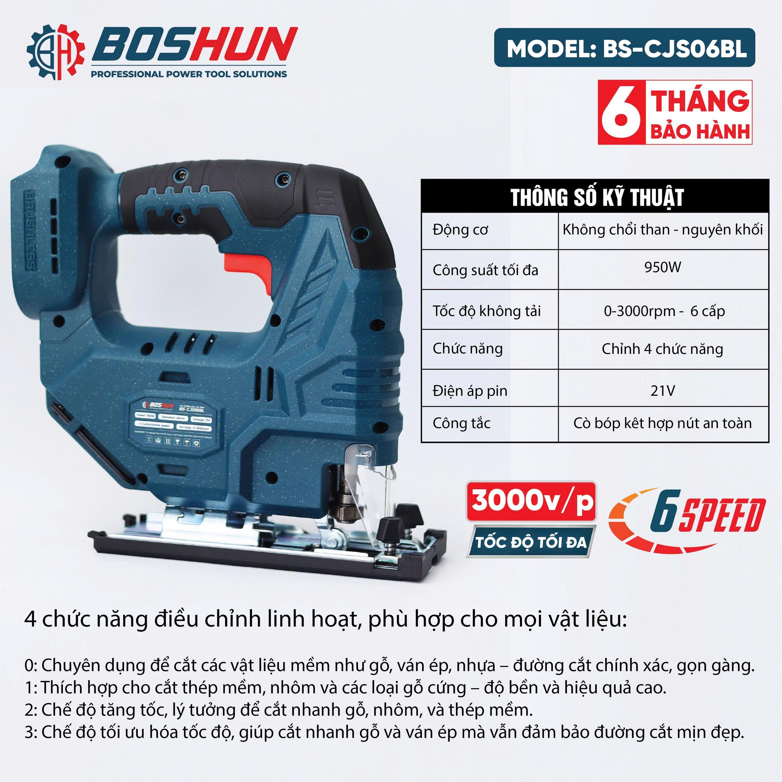 Tốc độ không tải: 0–3000 rpm – 6 cấp