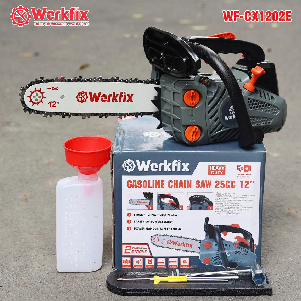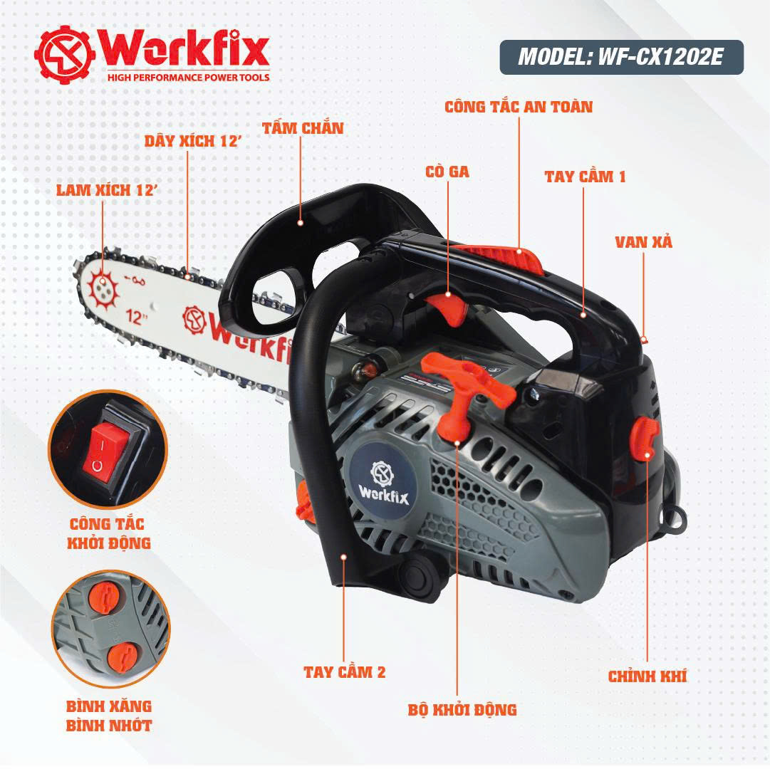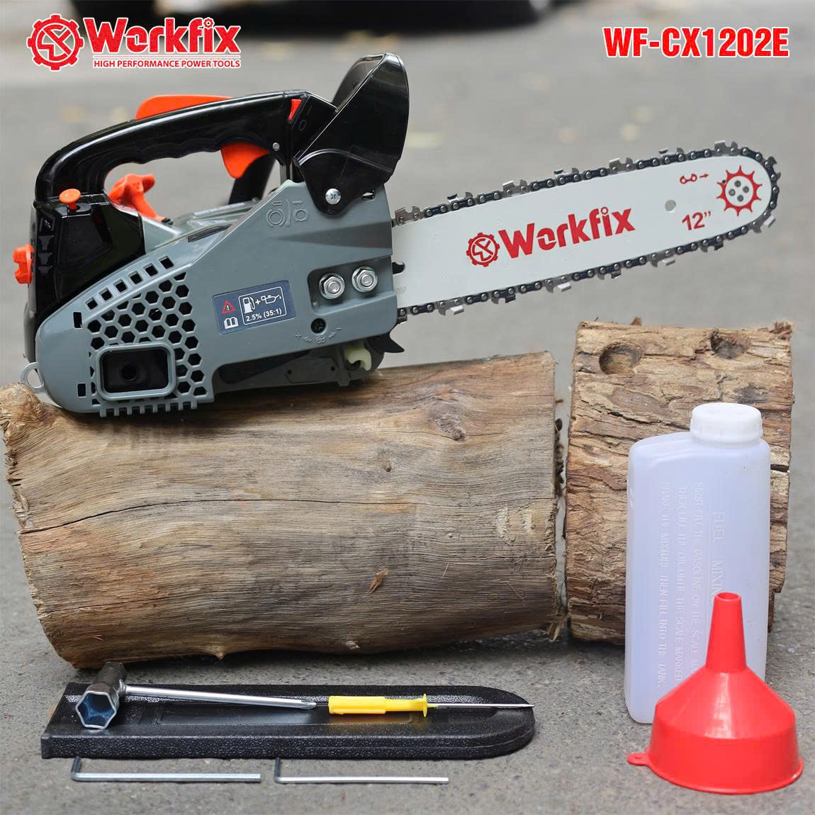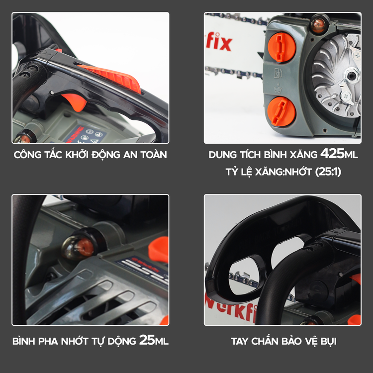 - PHỤ KIỆN: Ốp bảo vệ, Bình đựng xăng, Phễu đổ xăng, Cờ lê tháo, Tua vít tháo lắp, Dũa xích