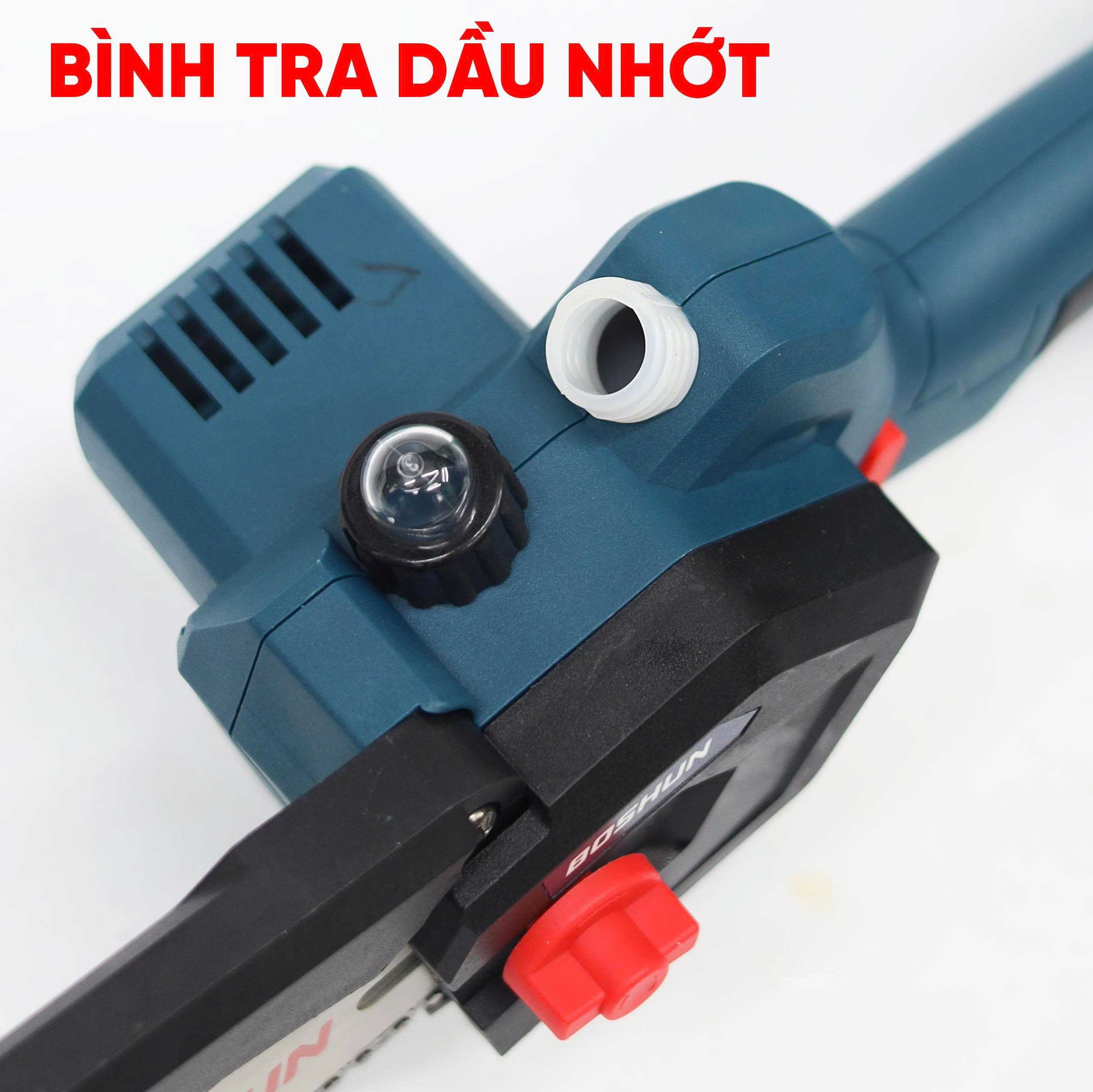 Máy cưa được trang bị bình tra nhớt tự động, giúp bôi trơn xích liên tục khi vận hành.