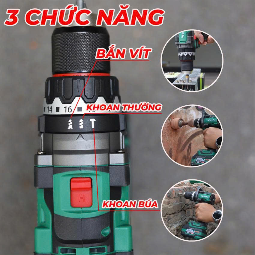 - 3 chức năng: Khoan, búa, vít