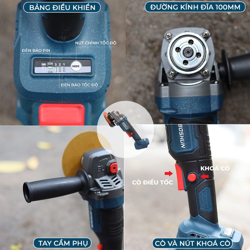 Máy mài được trang bị tay cầm phụ, có cò điều tốc và khóa nút tiện lợi giúp dễ dàng thao tác khi làm việc