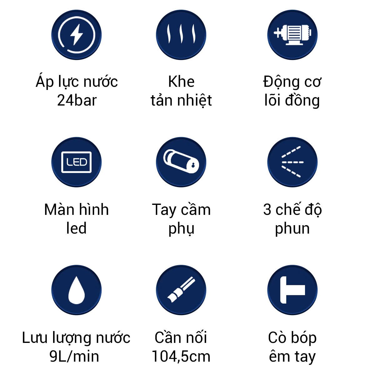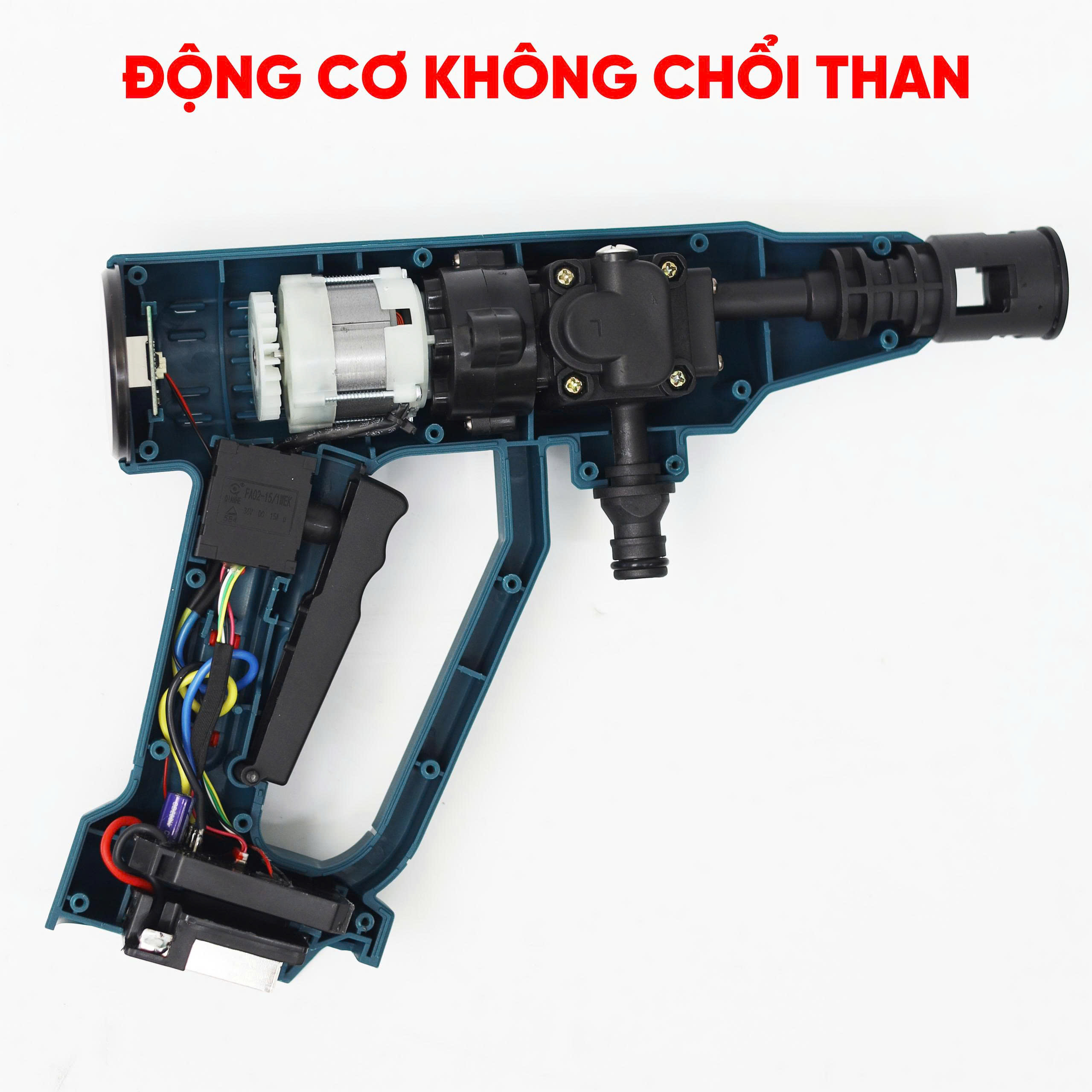 Máy rửa xe được trang bị động cơ không chổi than, 100% lõi đồng giúp máy hoạt động bền bỉ, tuổi thọ cao gấp 2 lần những dòng máy thông thường