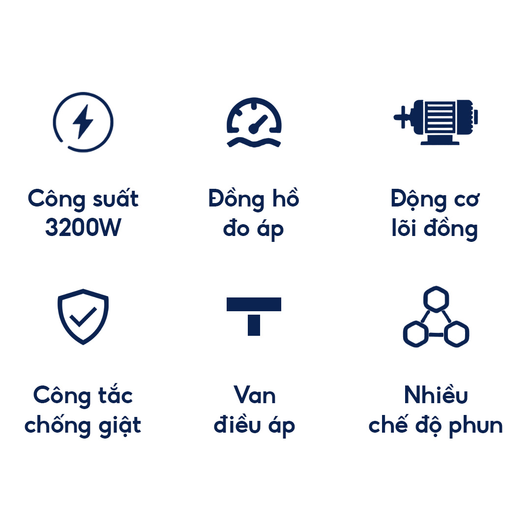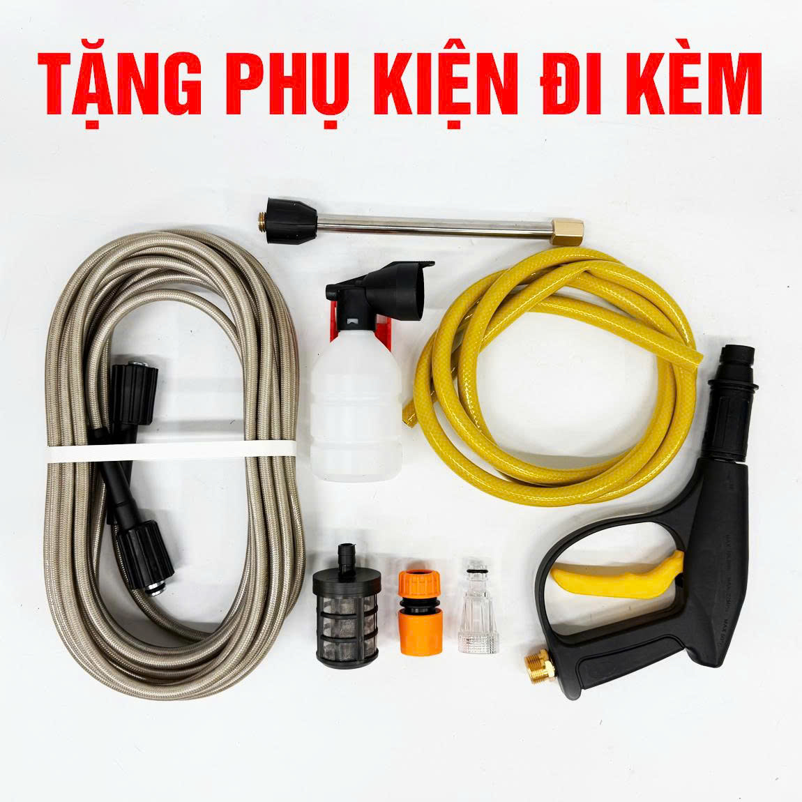 Tặng bộ phụ kiện đầy đủ bao gồm: dây cao áp 12m, bình tạo bọt, đầu phun, đầu lọc rác, cút nối, dây hút nước