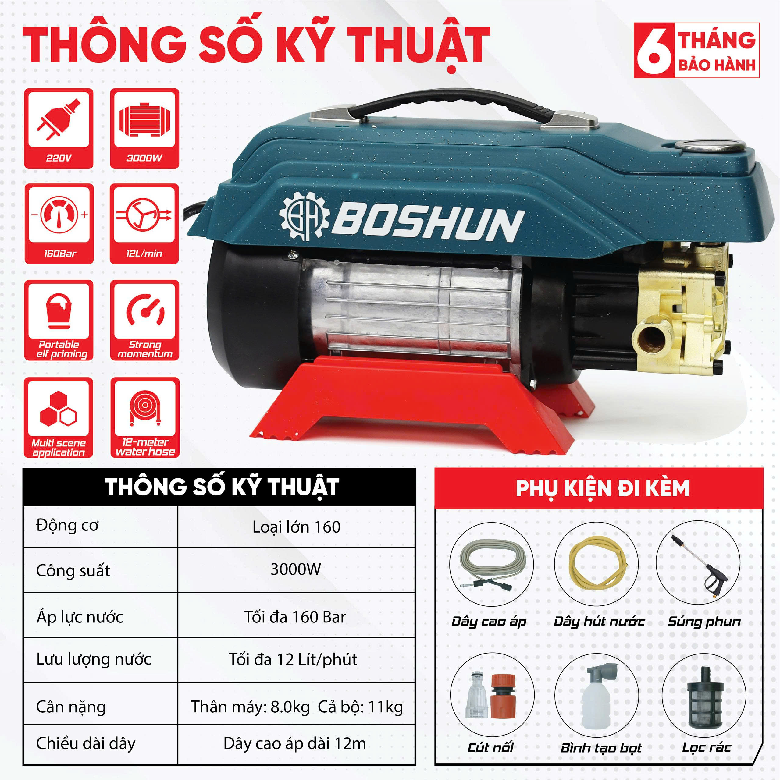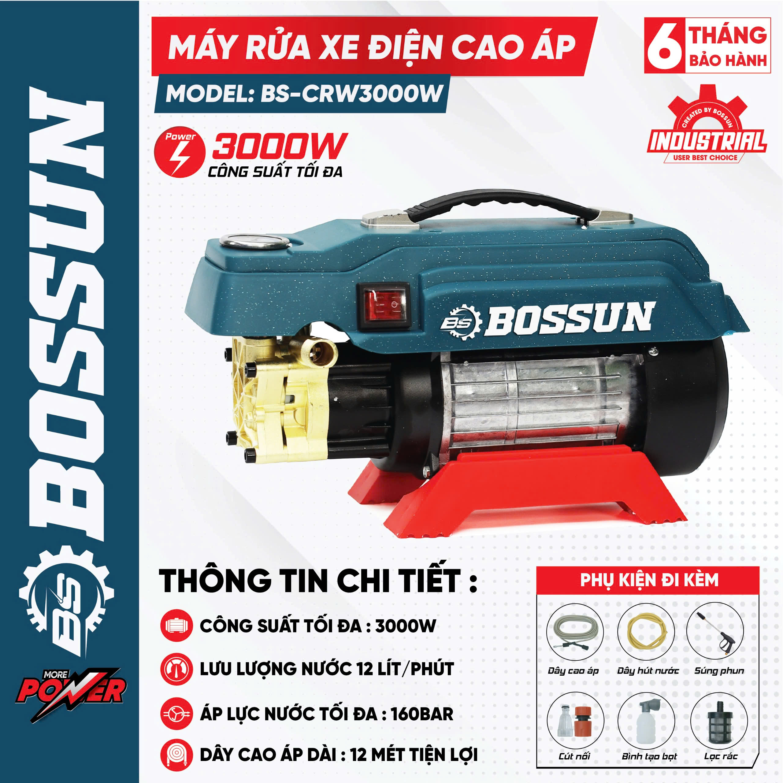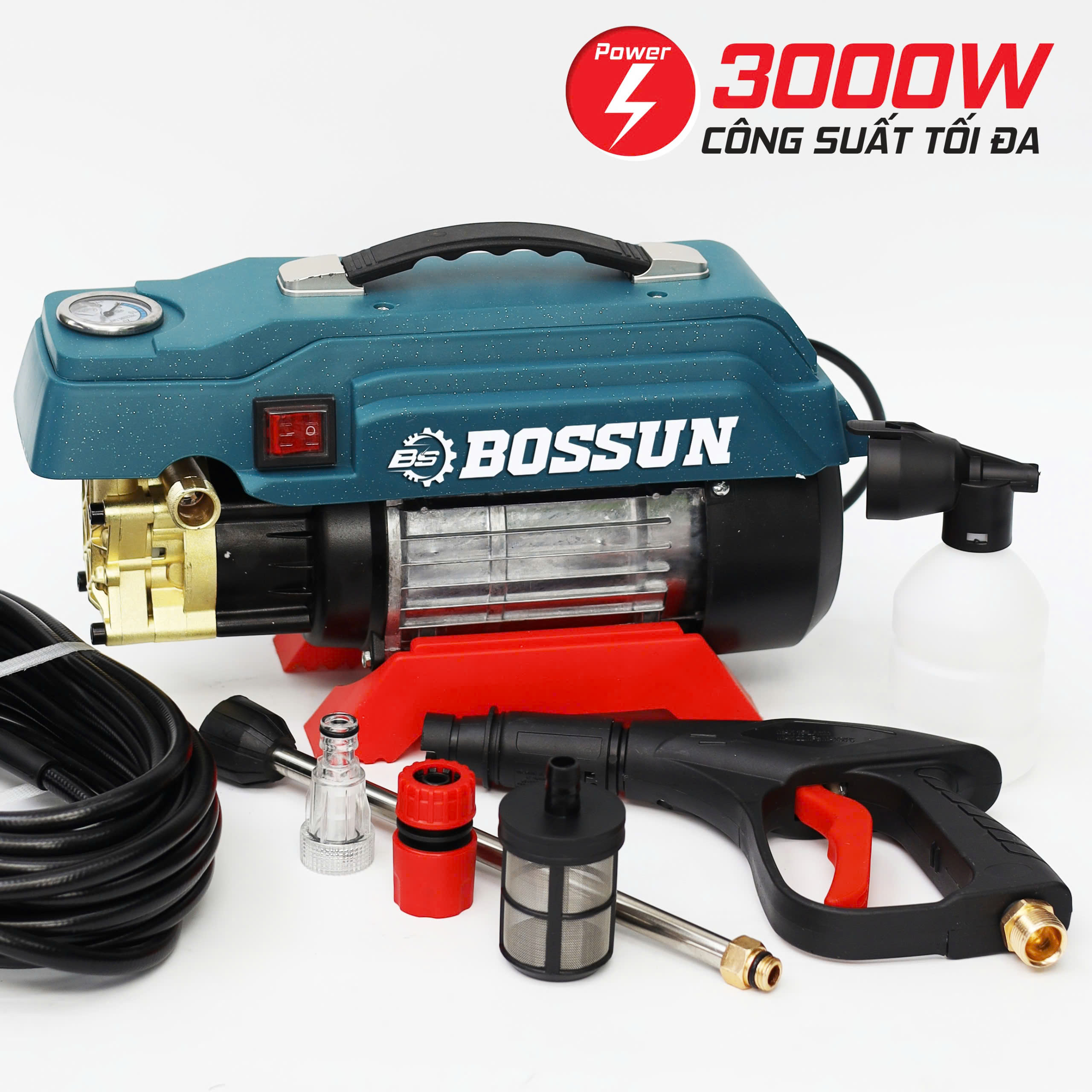Máy rửa xe Boshun có công suất lớn 3000W giúp rửa sạch mọi loại bụi bần