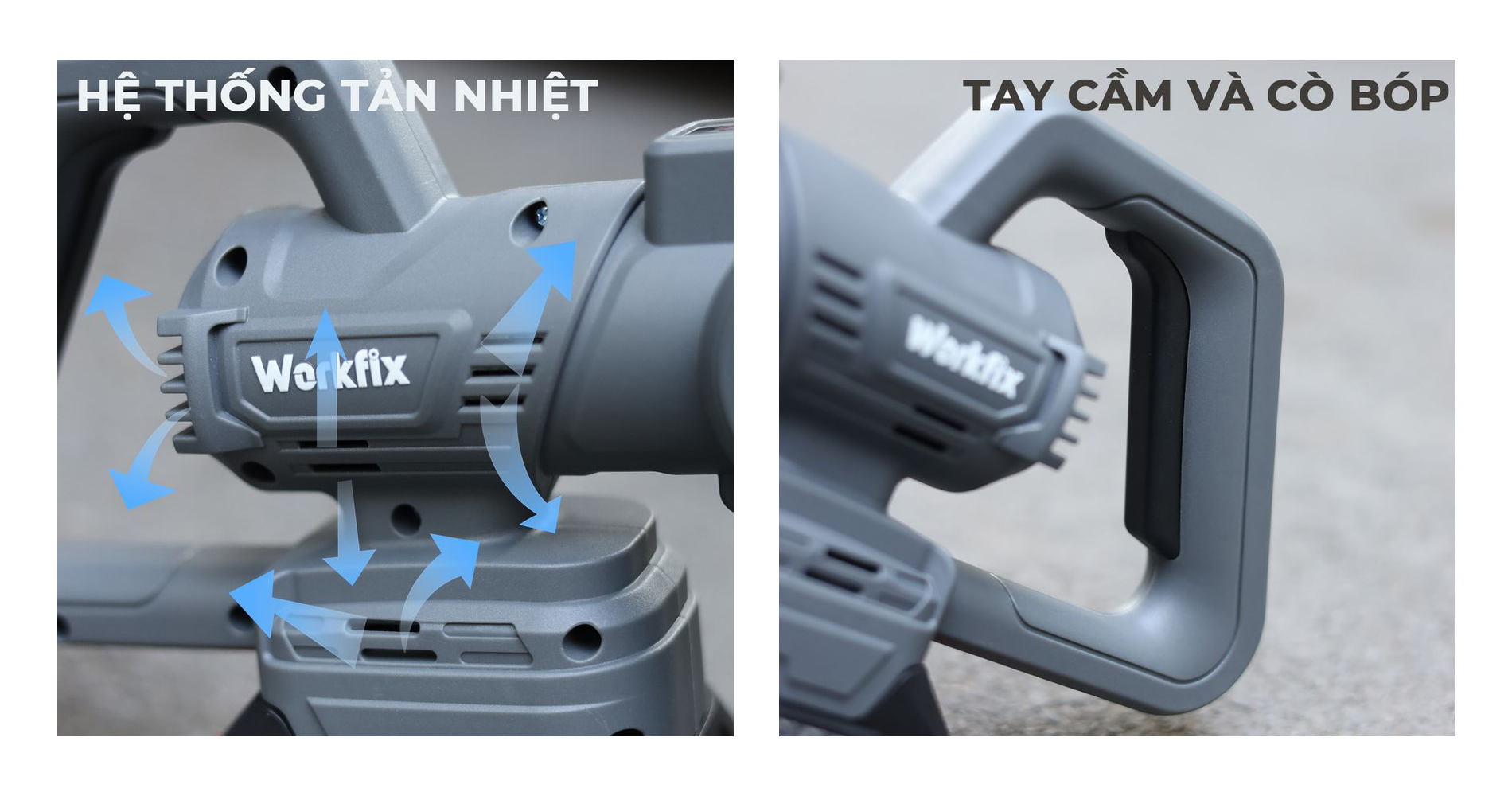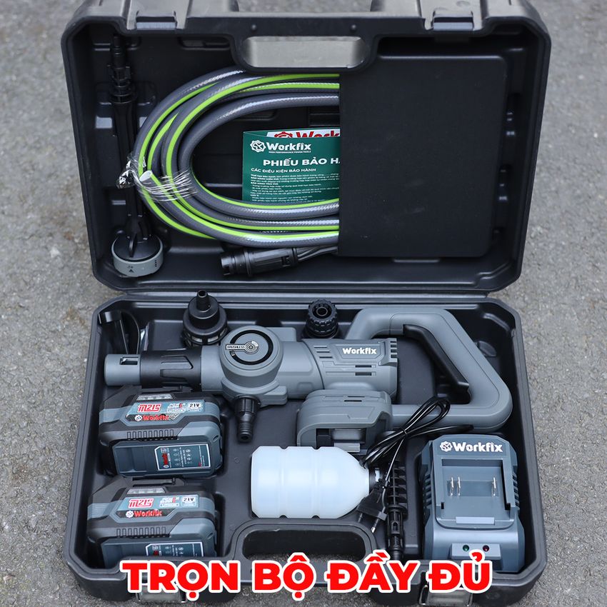 Máy rửa xe Workfix có công suất lớn, áp lực cực đại giúp đánh bay mọi loại vết bẩn, xịt nhanh, mạnh, phun đều, phun xa