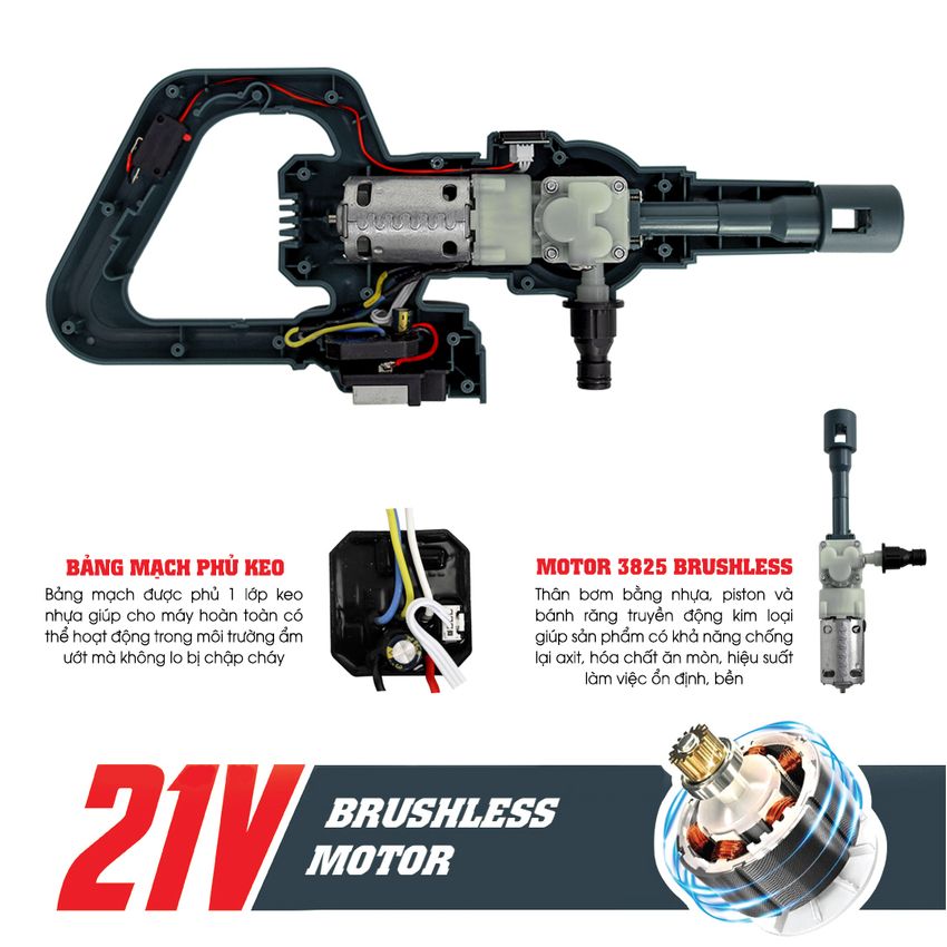 Máy rửa xe PW3825BL sử dụng động cơ 100% lõi đồng không chổi than cao cấp, công suất lên tới 305W, giúp cho máy có áp suất cao 60bar, có thể hoạt động bền bỉ, tiêu hao ít năng lượng hơn 30% so với máy bình thường