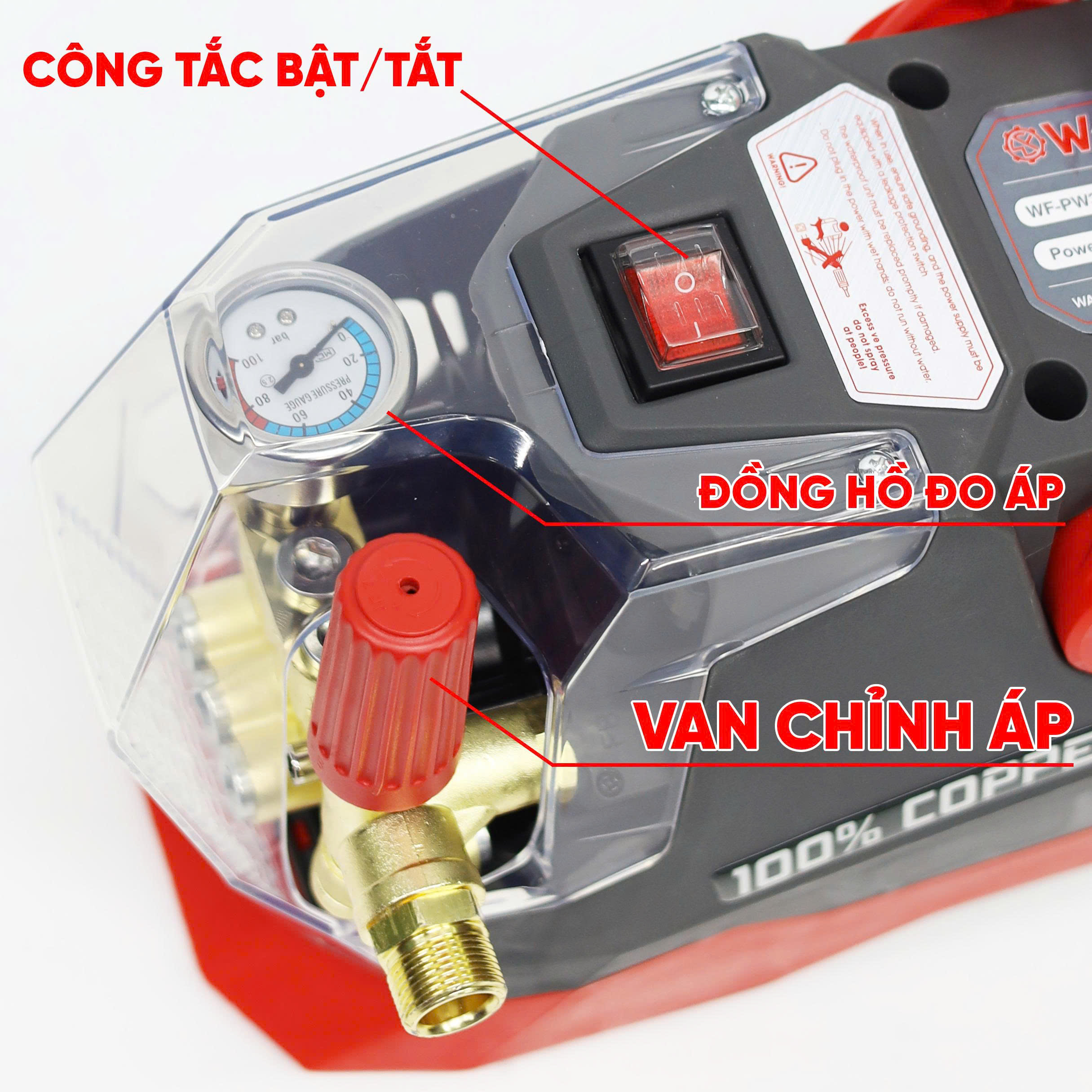 Máy có đồng hồ đo áp và van chỉnh áp tiện lợi, có thể điều chỉnh linh hoạt cho phù hợp với mục đích sử dụng