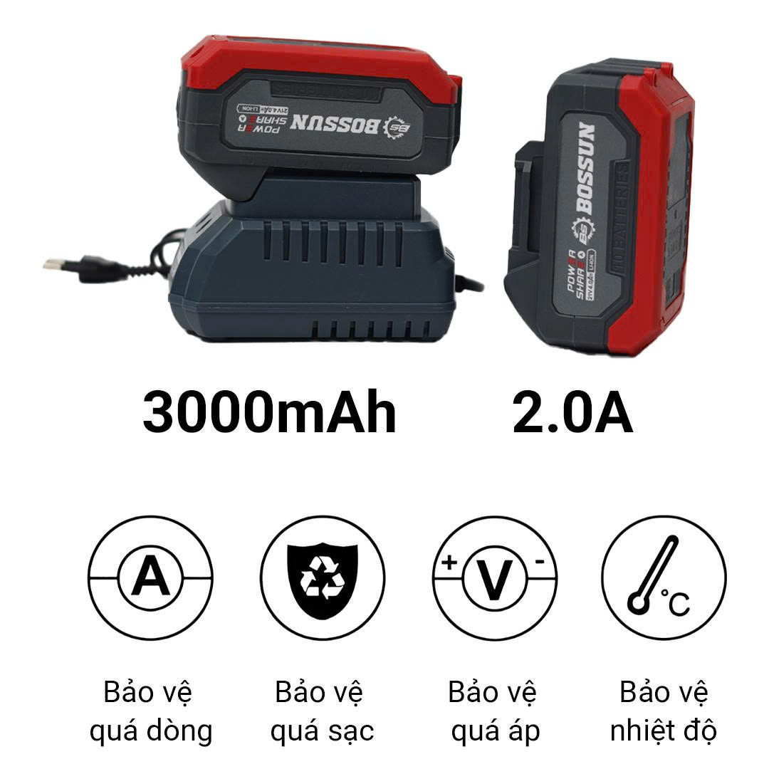 Bộ gồm 2 pin 10cell 21V/4Ah, sử dụng liên tục lên tới 3-4h không làm gián đoạn công việc. Sạc pin nhanh, trong vòng 1h.