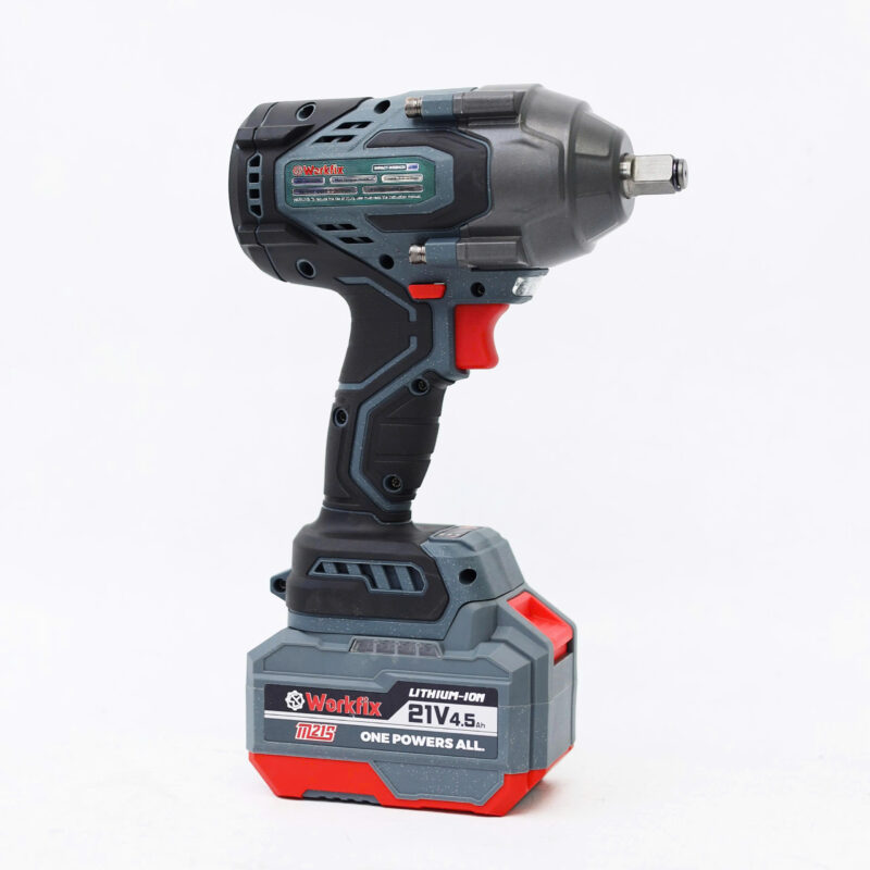 Máy siết bulong Workfix trang bị 2 pin 4,5 Ah mỗi pin thiết kế mạch 4 mosfet cho dòng xả cao tránh ngừng ngắt khi sử dụng, có mã vạch trên từng cell và đèn báo pin riêng biệt trên mỗi quả pin, thời gian làm việc liên tục từ 4- 5h