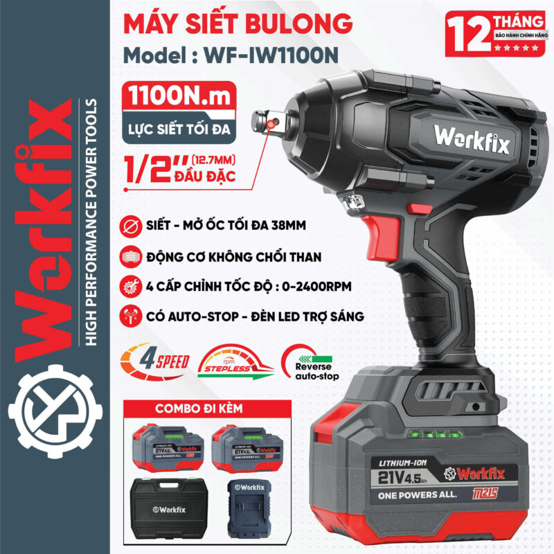 Máy Siết Bulong Dùng Pin WORKFIX WF-IW1100N, Lực Siết 1100N.m, Có Auto-stop, Đèn LED Siêu Sáng
