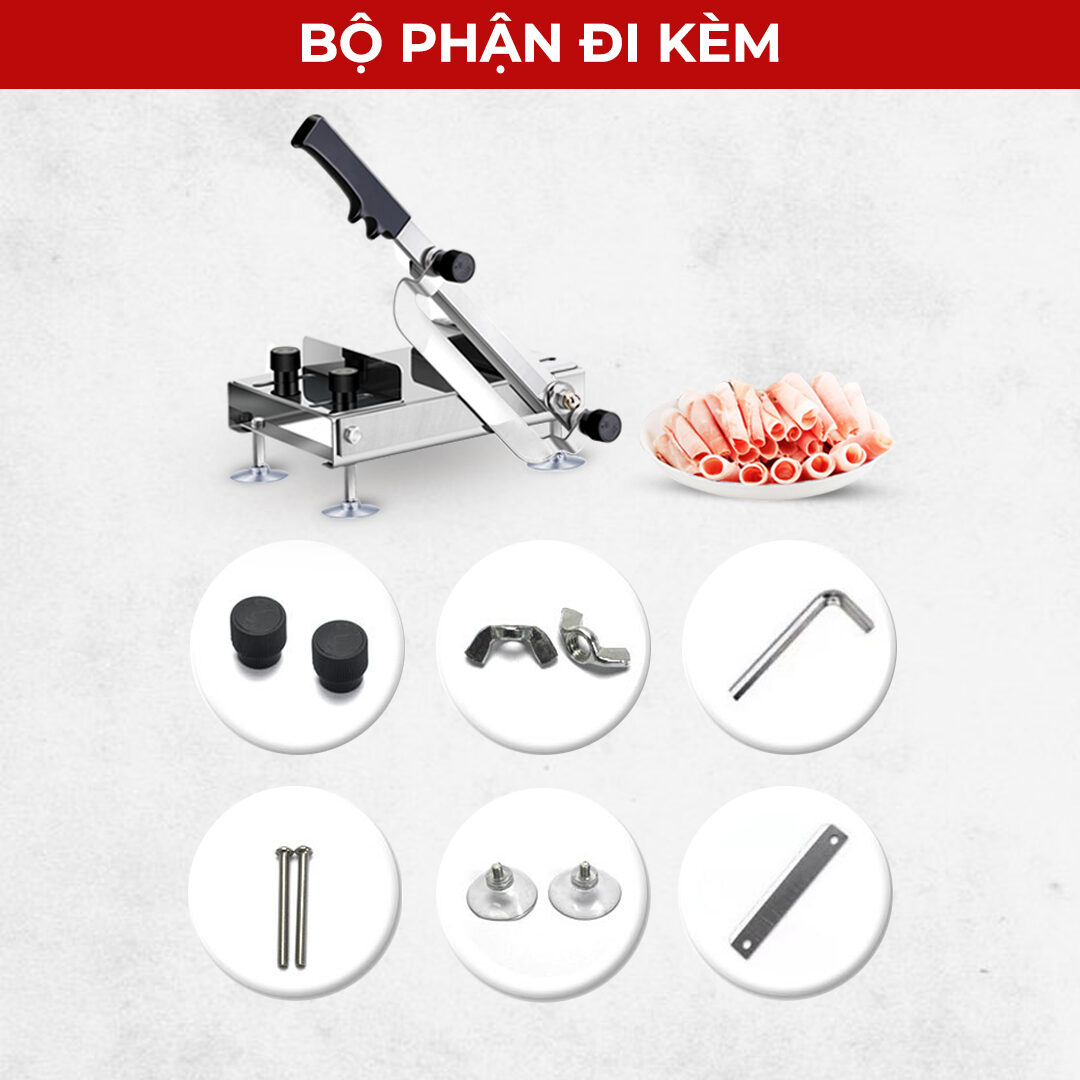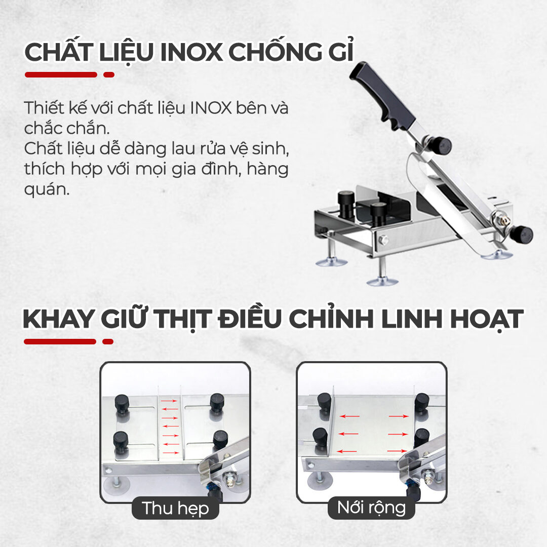 Mặt bàn thái có sự hỗ trợ của 1 khuôn chắn thông dụng có thể tháo rời. Khuôn chắn giúp thái cắt thực phẩm đông lạnh dễ dàng không sợ trơn trượt trong quá trình thái.