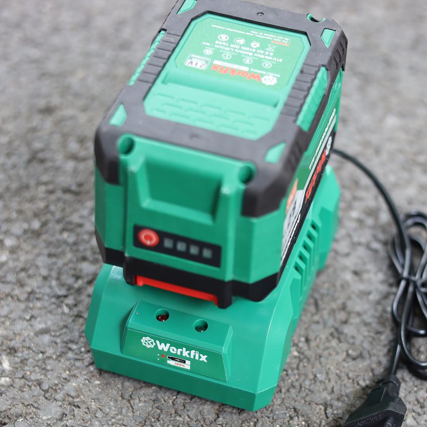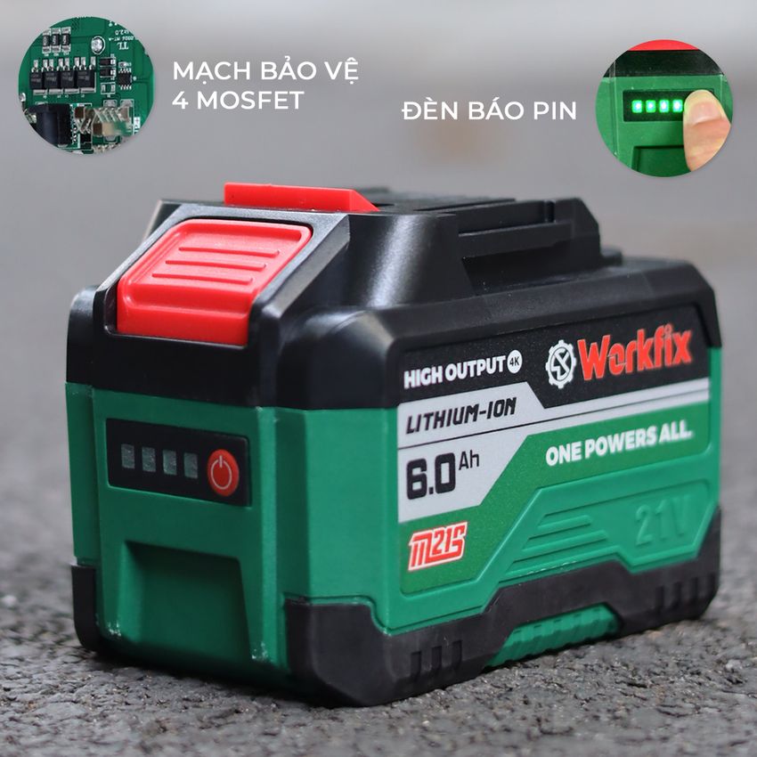 Máy được trang bị viên pin Workfix One PowerAll 15 cell, mỗi pin thiết kế mạch 4 mosfet cho dòng xả cao tránh ngừng ngắt khi sử dụng thời gian làm việc của mỗi pin là liên tục từ 4-5h