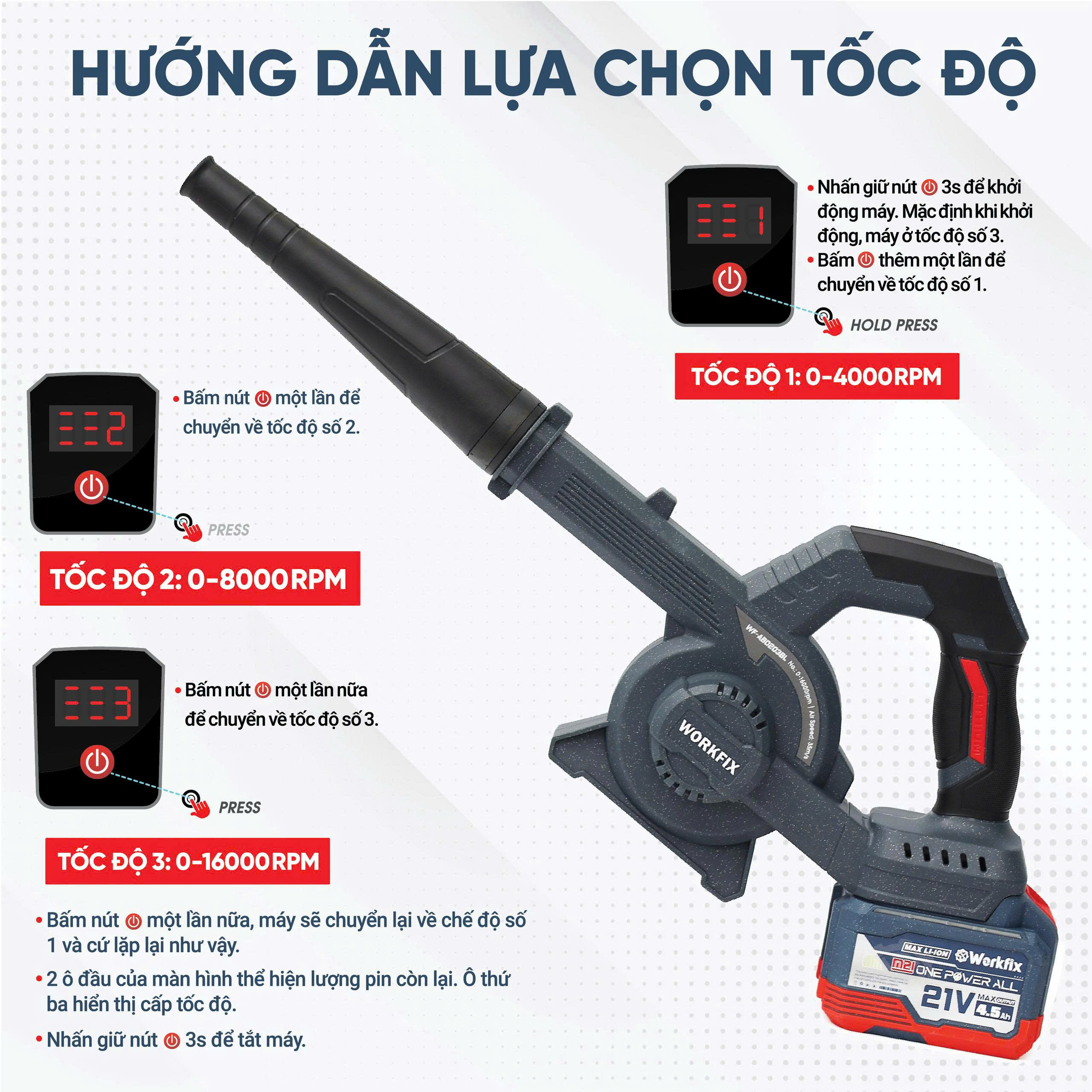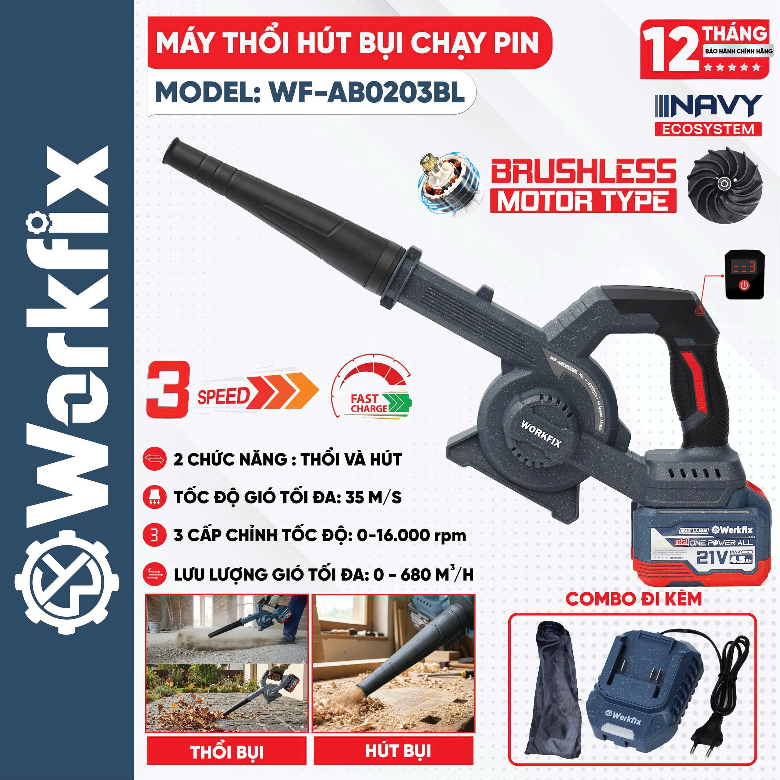 Chính hãng Máy Thổi, Hút Bụi Workfix WF-AB0203BL, Lực Mạnh, Gọn Nhẹ, Tặng Túi Đựng Rác + Sạc Nhanh