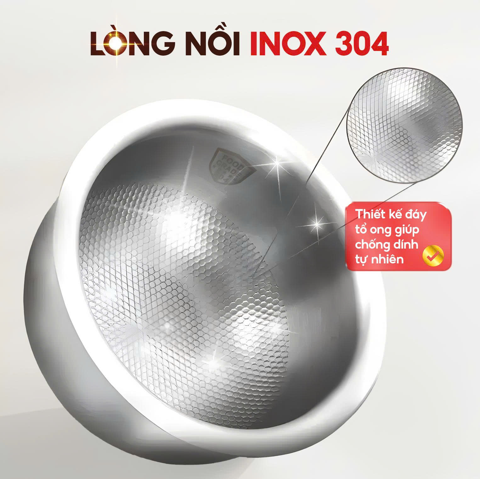 Khả năng truyền nhiệt nhanh, giữ ấm tốt. Lòng nồi cơm điện được làm từ inox 304 siêu bền giúp việc vệ sinh trở nên dễ dàng, nhanh chóng