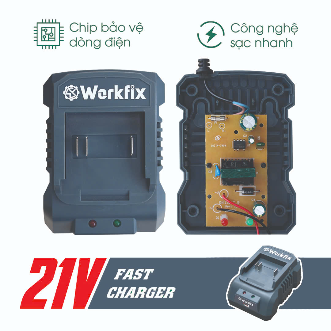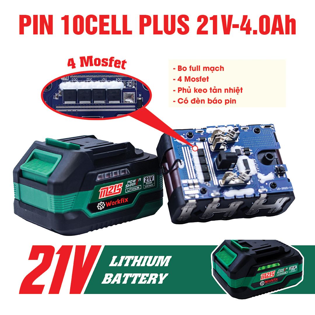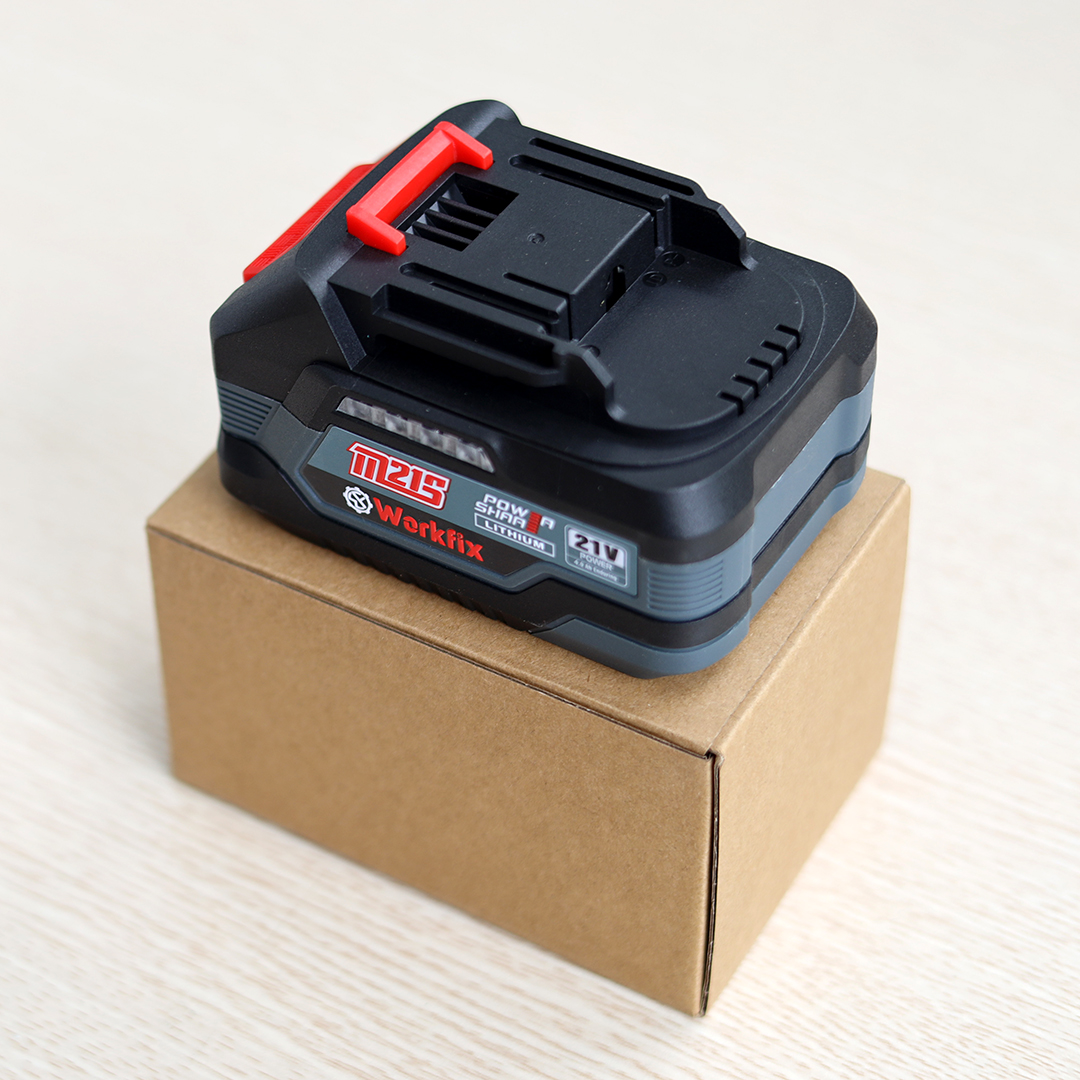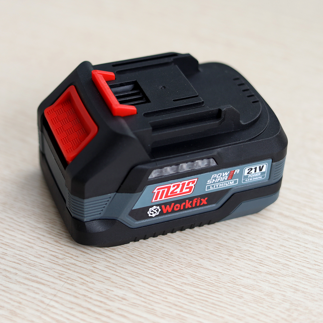 Pin Workfix có dung lượng 4.0AH, dòng điện 21V có thể sử dụng liên tục từ 1-4 giờ tùy từng thiết bị